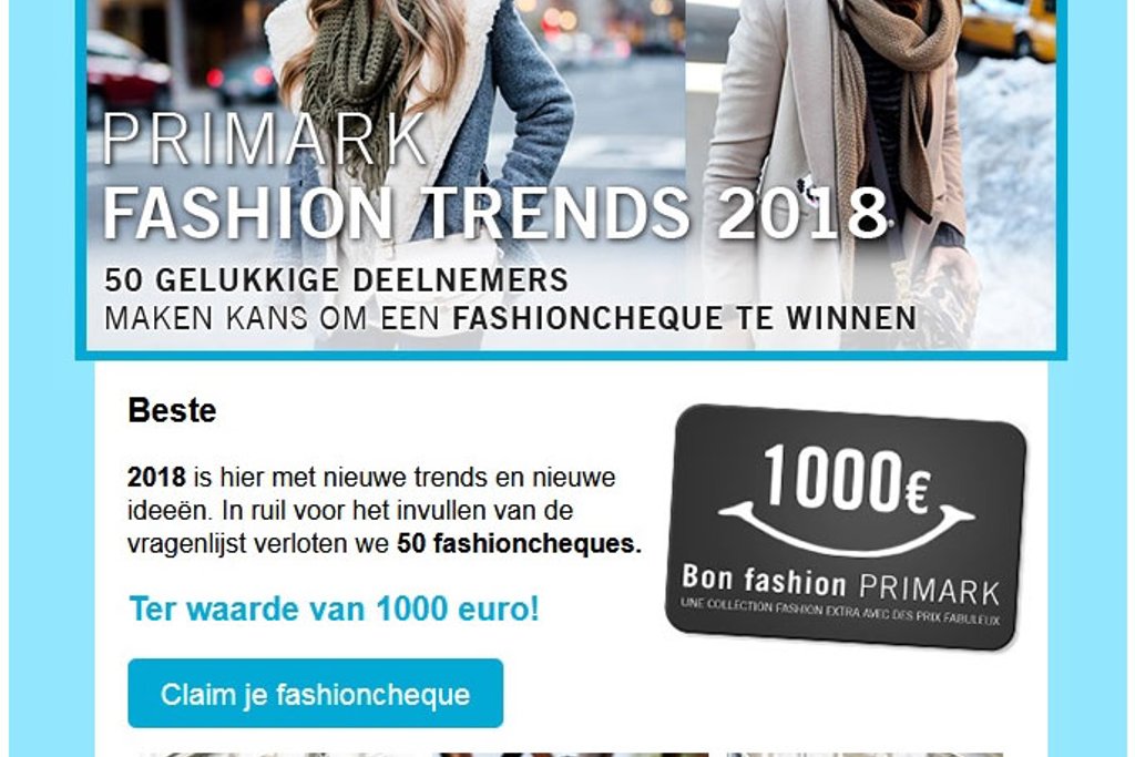 Er is een e-mail in omloop die uit naam van Primark verstuurd is. Volgens het bericht zou je een fashioncheque ter waarde van €1000,- gewonnen hebben.