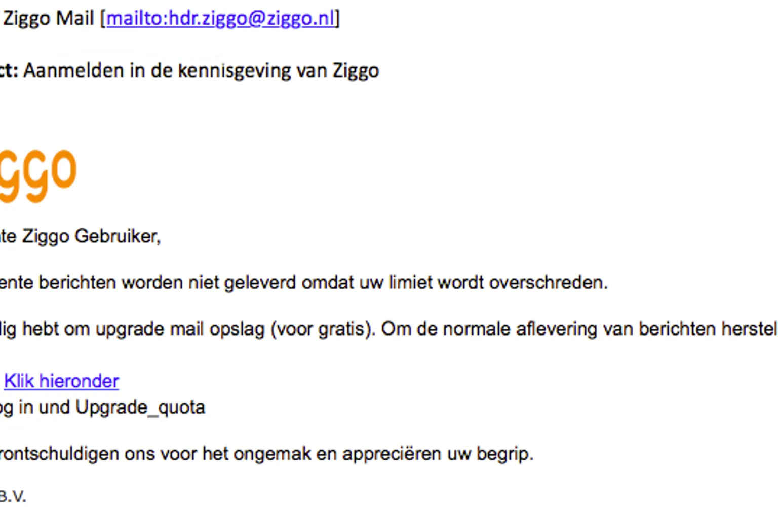In een valse e-mail van 'Ziggo' staat in slecht Nederlands geschreven dat je de opslagcapaciteit van jouw mailbox moet upgraden naar een hoger limiet. Dit om 'de normale aflevering van berichten herstellen', zo valt te lezen.