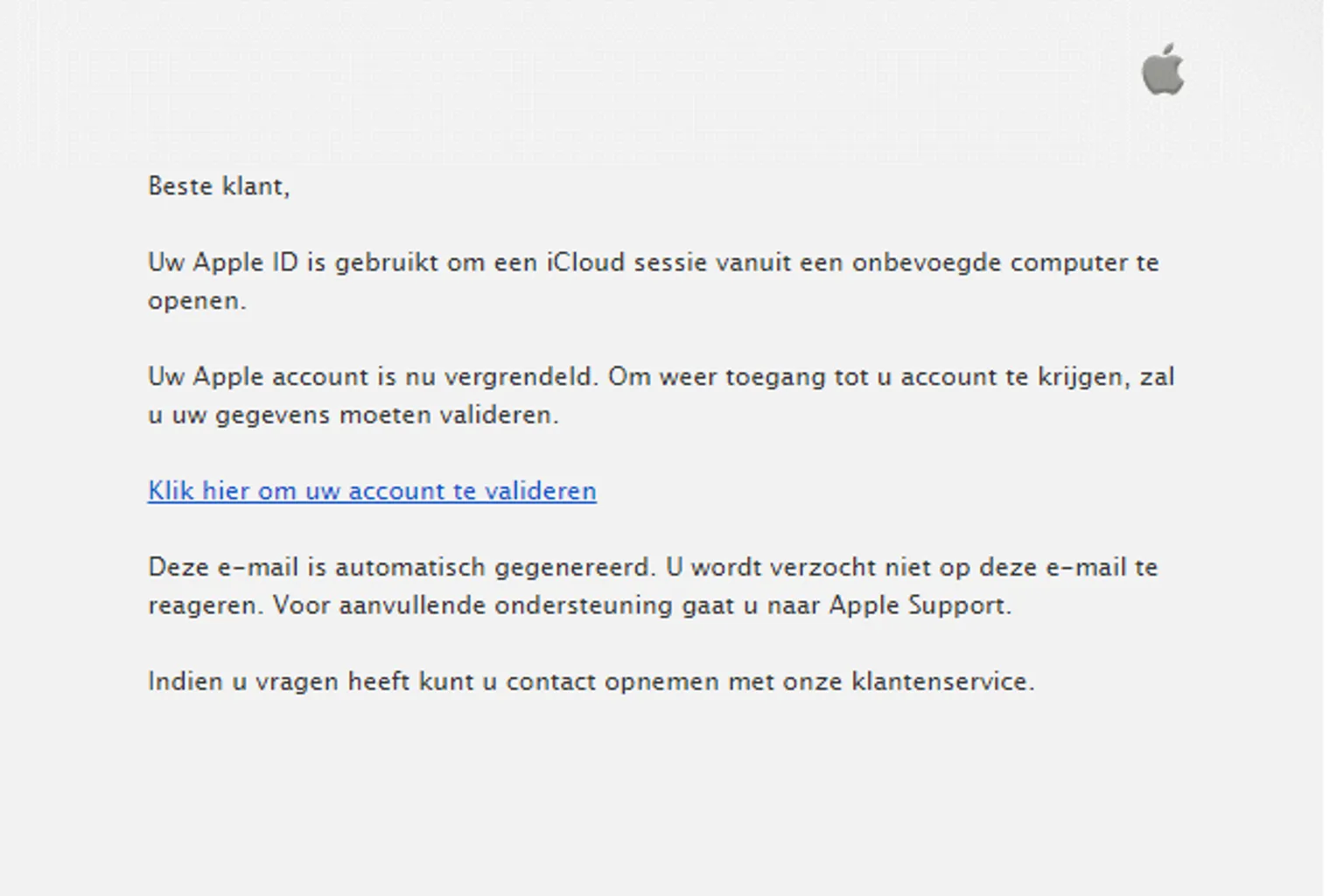 Volgens de e-mail zou jouw Apple ID gebruikt zijn om een iCloud sessie vanuit een onbevoegde computer te openen. Daarom is de account nu vergrendeld. Om weer toegang te krijgen moet je op een link klikken en je gegevens valideren.