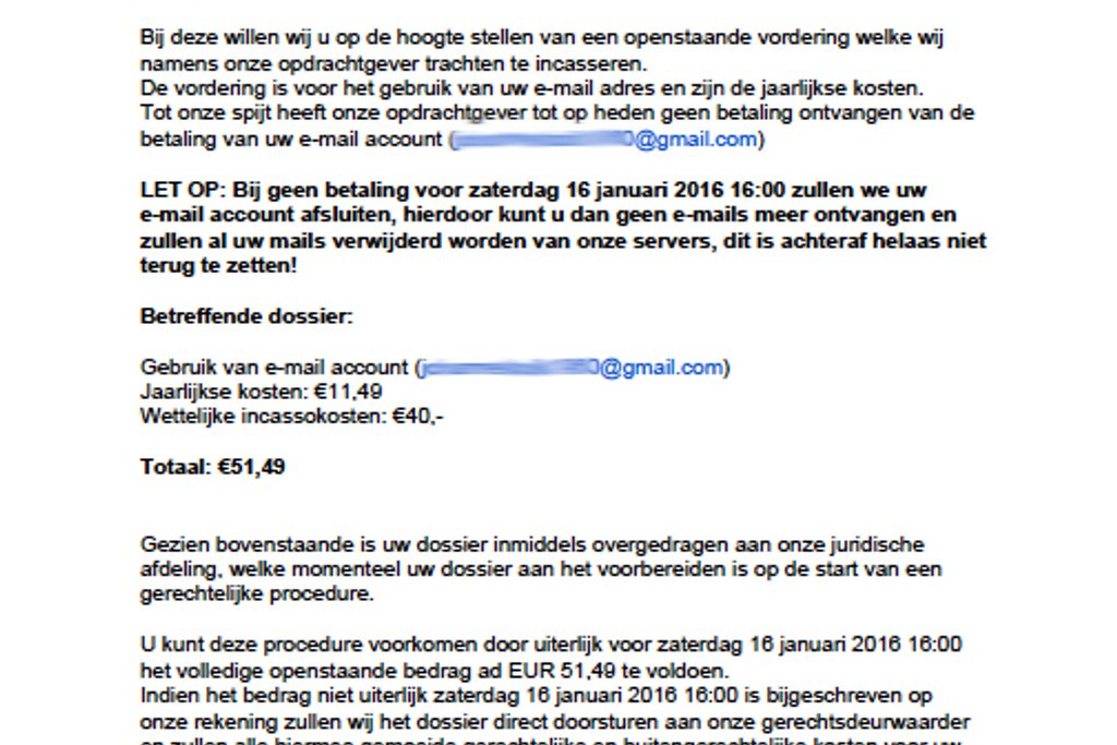 Er zou betaald moeten worden voor het gebruik van het e-mailadres. In totaal gaat het volgens de mail om een bedrag van 51,49 euro. Dit bedrag zou voor 16 januari betaald moeten worden. Het is overigens mogelijk dat deze mail nog steeds wordt verstuurd, maar dan met een andere 'vervaldatum'.