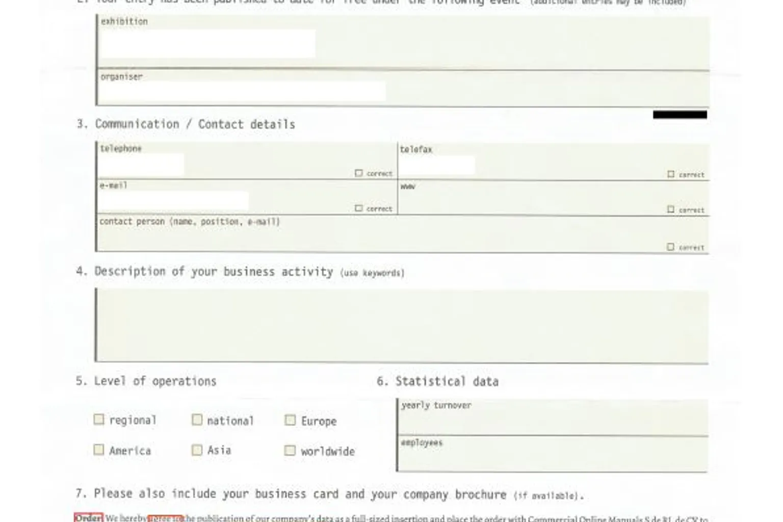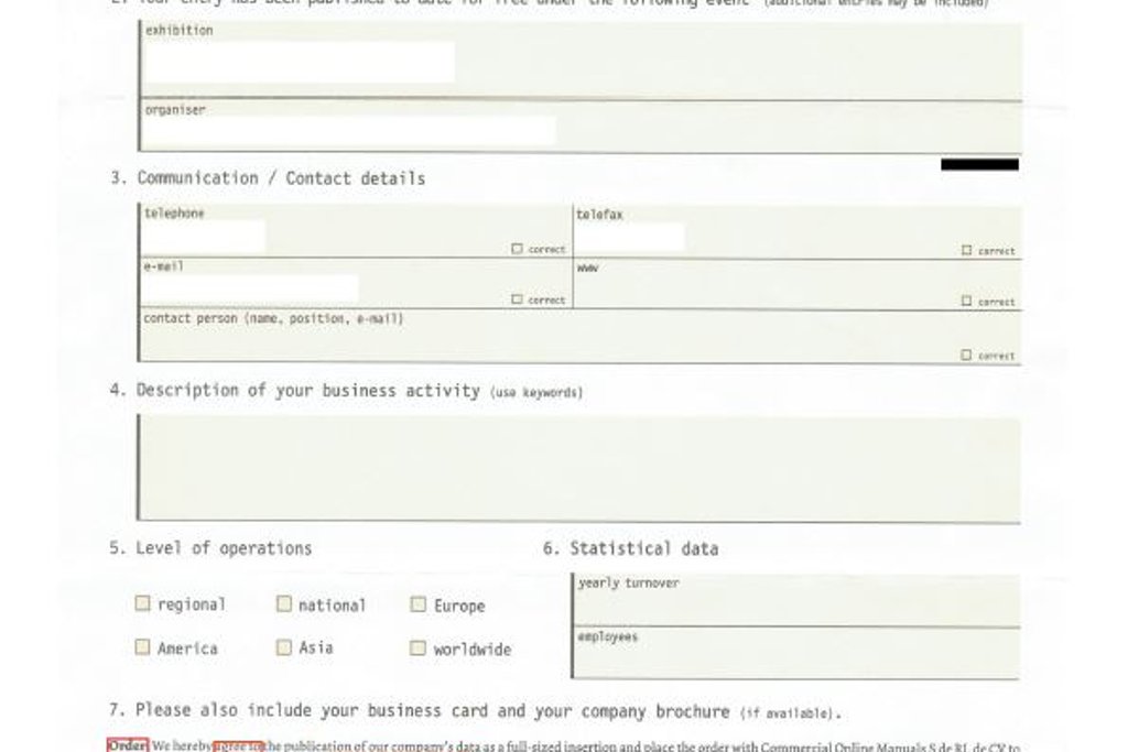 De internationale aanbieder wekt met het formulier de suggestie dat het document iets te maken heeft met een beurs waar de ondernemer aan deel heeft genomen. De ondernemer moet alles controleren zodat de gegevens weer up-to-date zijn.
