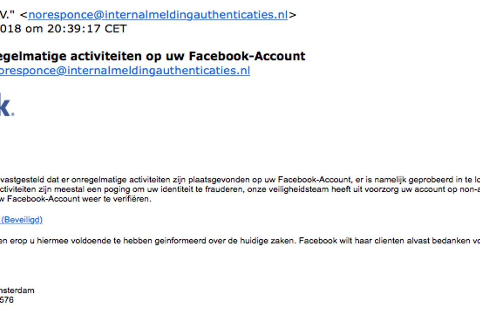 Er is een e-mail in omloop waarin staat dat er geprobeerd zou zijn in te loggen op je Facebook-account vanaf een onbekend IP-adres. De mail is geschreven uit naam van Facebook.
