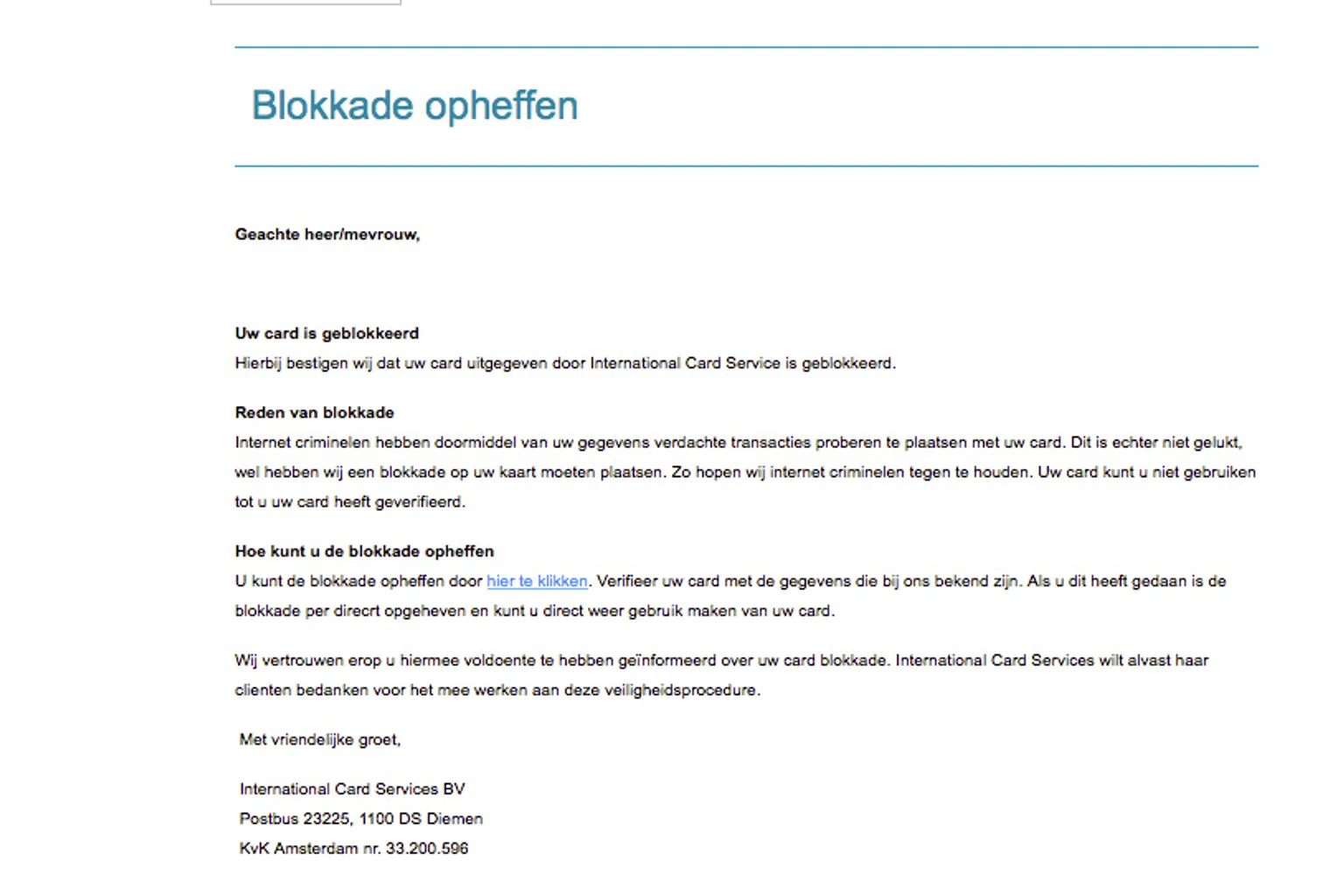 Wil je dat je kaart gedeblokkeerd wordt? Dan moet je je gegevens verifiëren. Dit doe je door op een link in het bericht te klikken en op de daaropvolgende pagina je creditcardgegevens in te vullen. Niet doen! Je creditcard is niet geblokkeerd. Wanneer je via de link inlogt, hengelen criminelen je codes binnen om te kunnen misbruiken.
