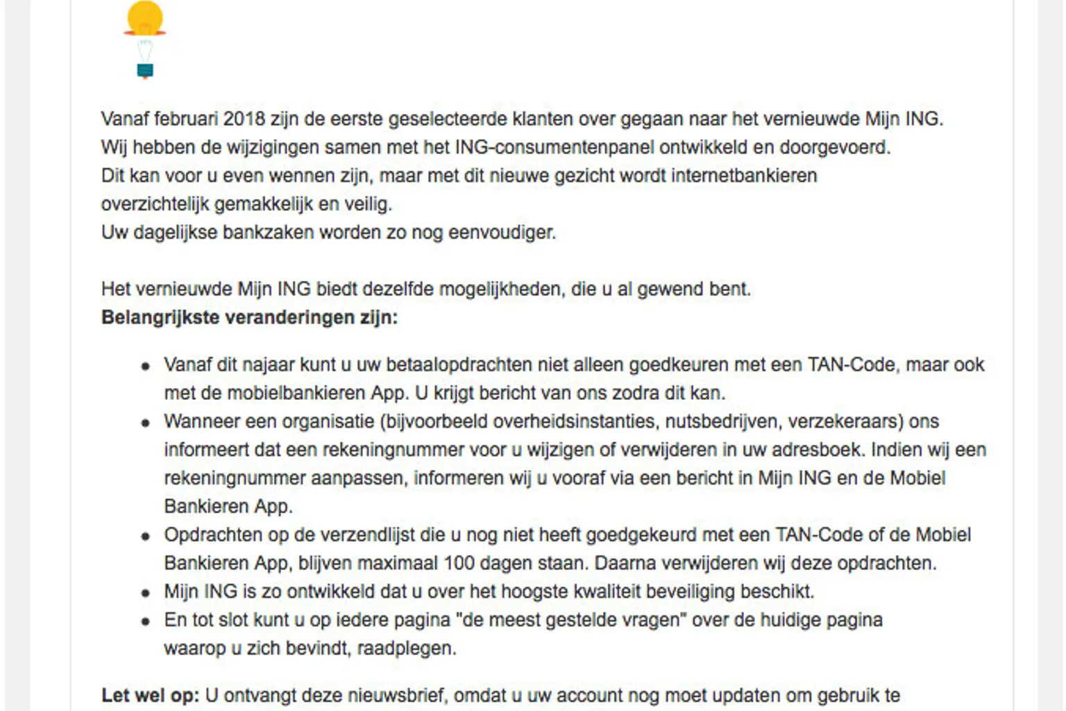 De nieuwe service richt zich voornamelijk op de Mobiel Bankieren App van ING. Je kunt niet alleen met TAN-codes, maar ook via de mobiel bankieren app betaalverzoeken goedkeuren. Dat dit sinds een tijd mogelijk is, dat klopt. Maar deze e-mail is niet afkomstig is van ING.