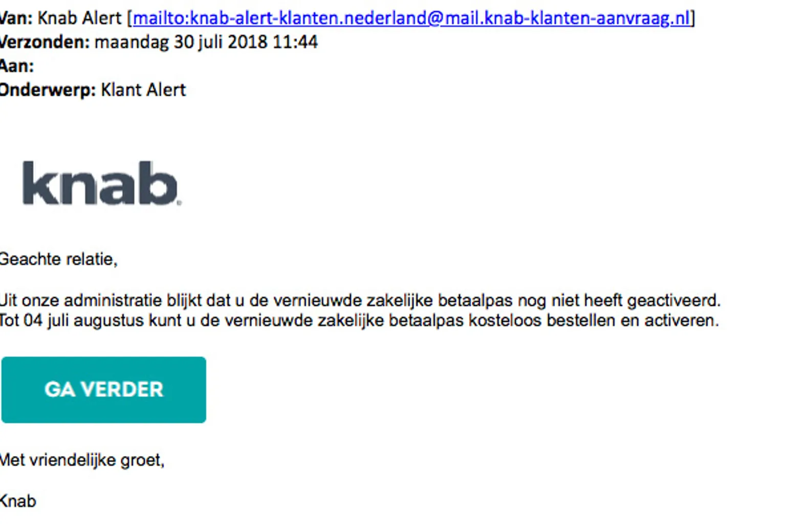 Er is een e-mail in omloop die afkomstig lijkt te zijn van Knab. Volgens het bericht zou je een nieuwe zakelijke betaalpas moeten bestellen en activeren. Bestel en activeer niets, het is een phishingmail.