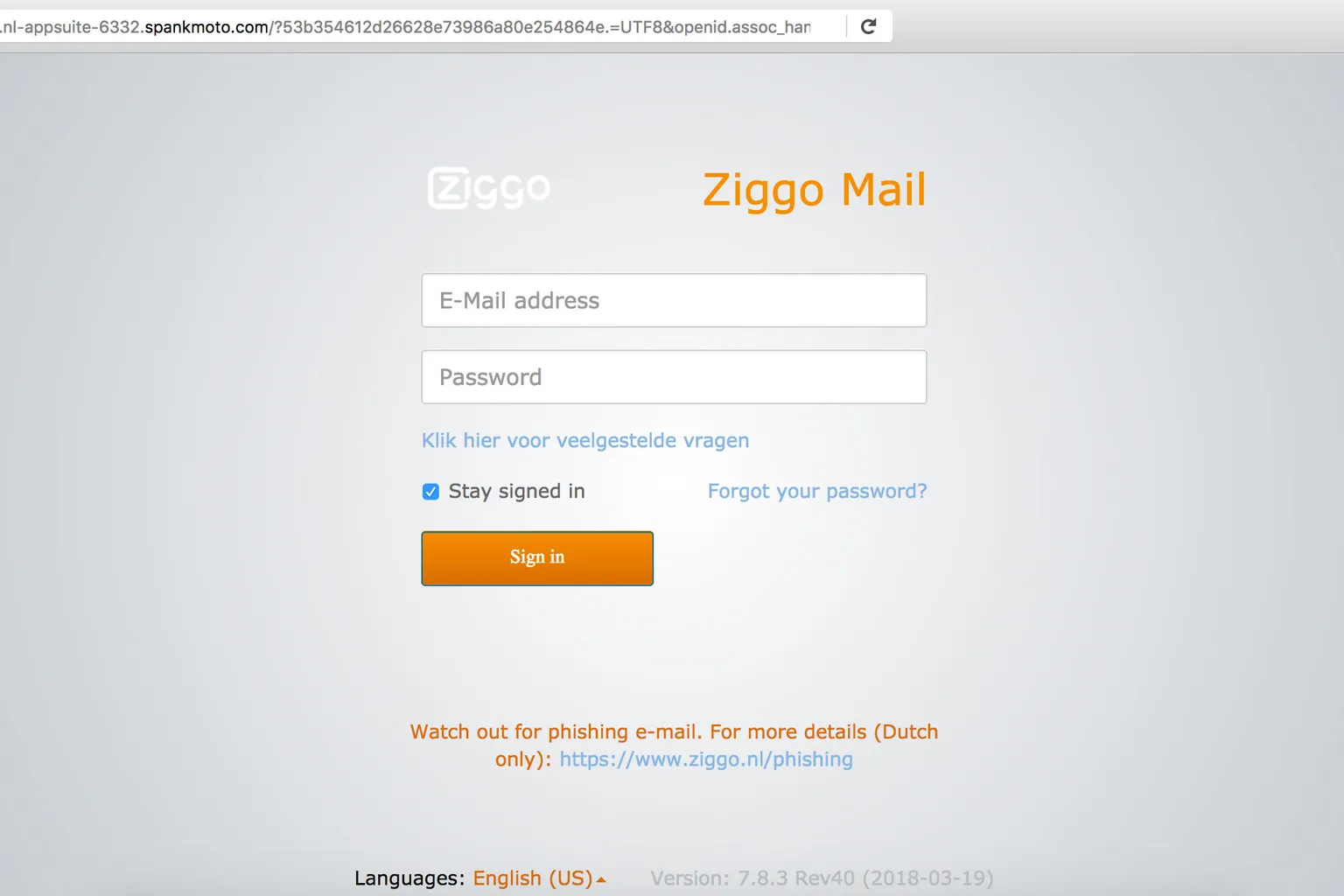 Je kunt aan de URL (in de adresbalk) zien dat deze niet overeenkomt met de URL van Ziggo. Daarnaast staat onderaan de pagina geschreven dat je moet uitkijken voor phishing. In deze boodschap staat een spelfout. De link naar de pagina waar je meer informatie over phishing kunt vinden, verwijst naar de officiële website van Ziggo. Het bedrijf heeft echter niets met de e-mail te maken.