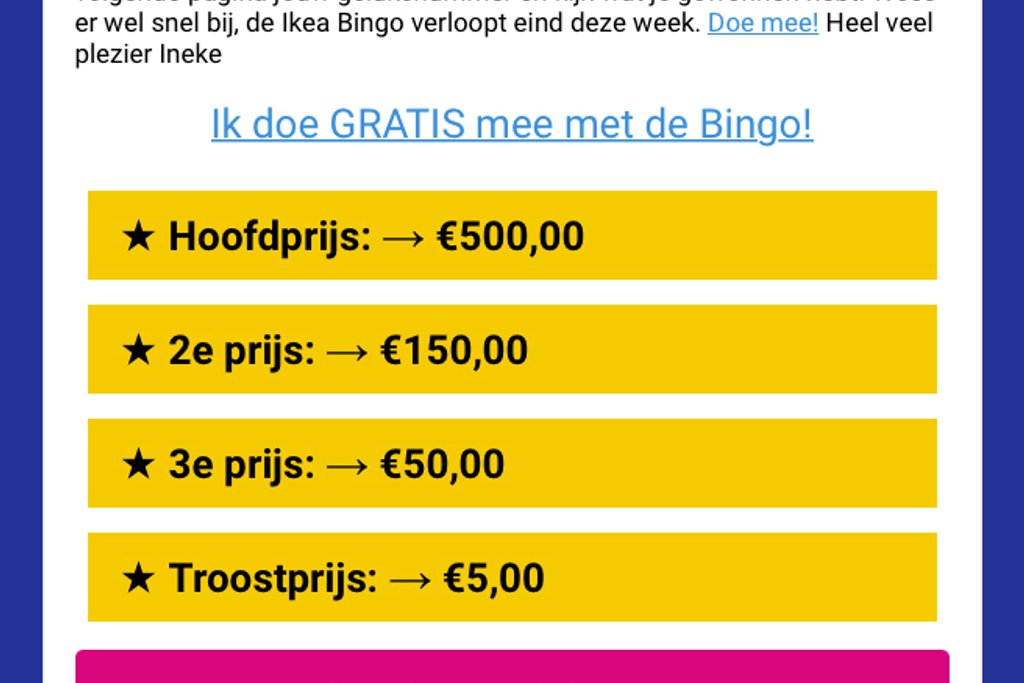 Er wordt een e-mail verstuurd door 'IKEA', waarin staat dat je bent geselecteerd om deel te nemen aan een bingo. Pas hiermee op! Nergens staat precies beschreven waar jij jezelf voor opgeeft als je deelneemt.