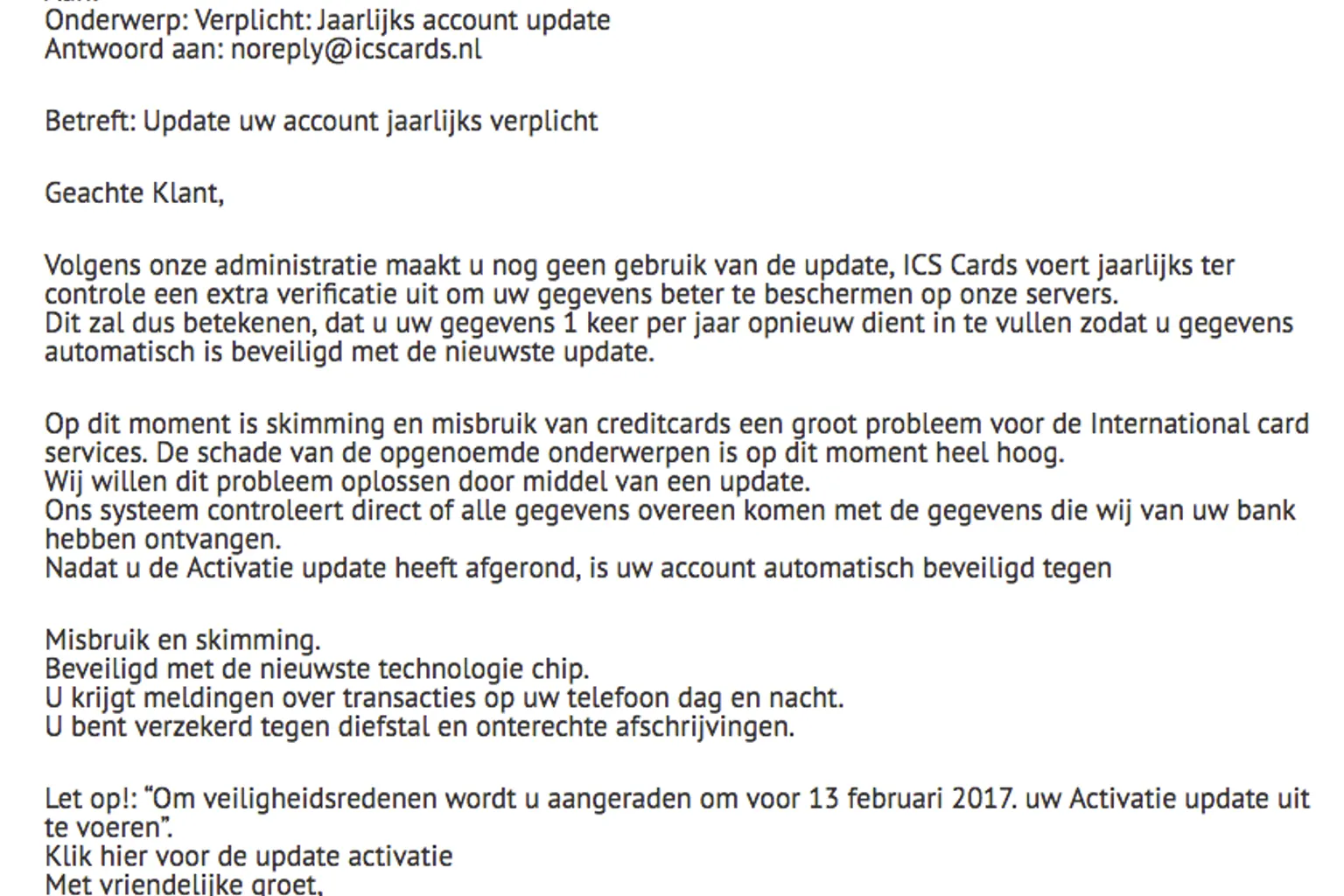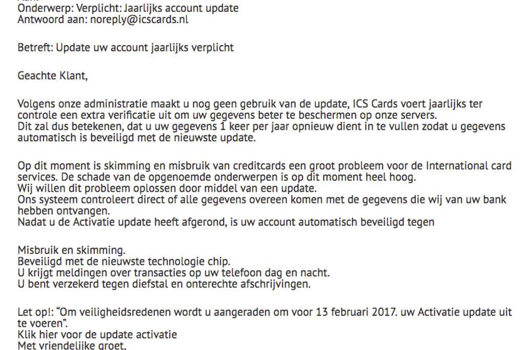Er wordt een e-mail verstuurd uit naam van ICS, waarin je wordt verzocht om je account te updaten. Trap hier niet in!