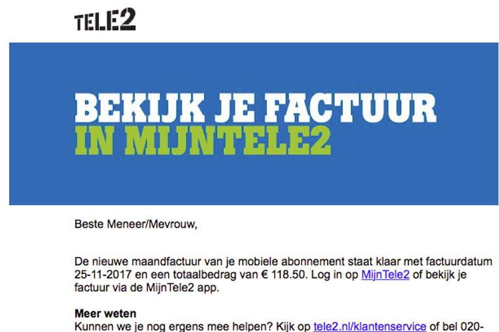 Pas op voor valse e-mail 'Tele2' over maandfactuur