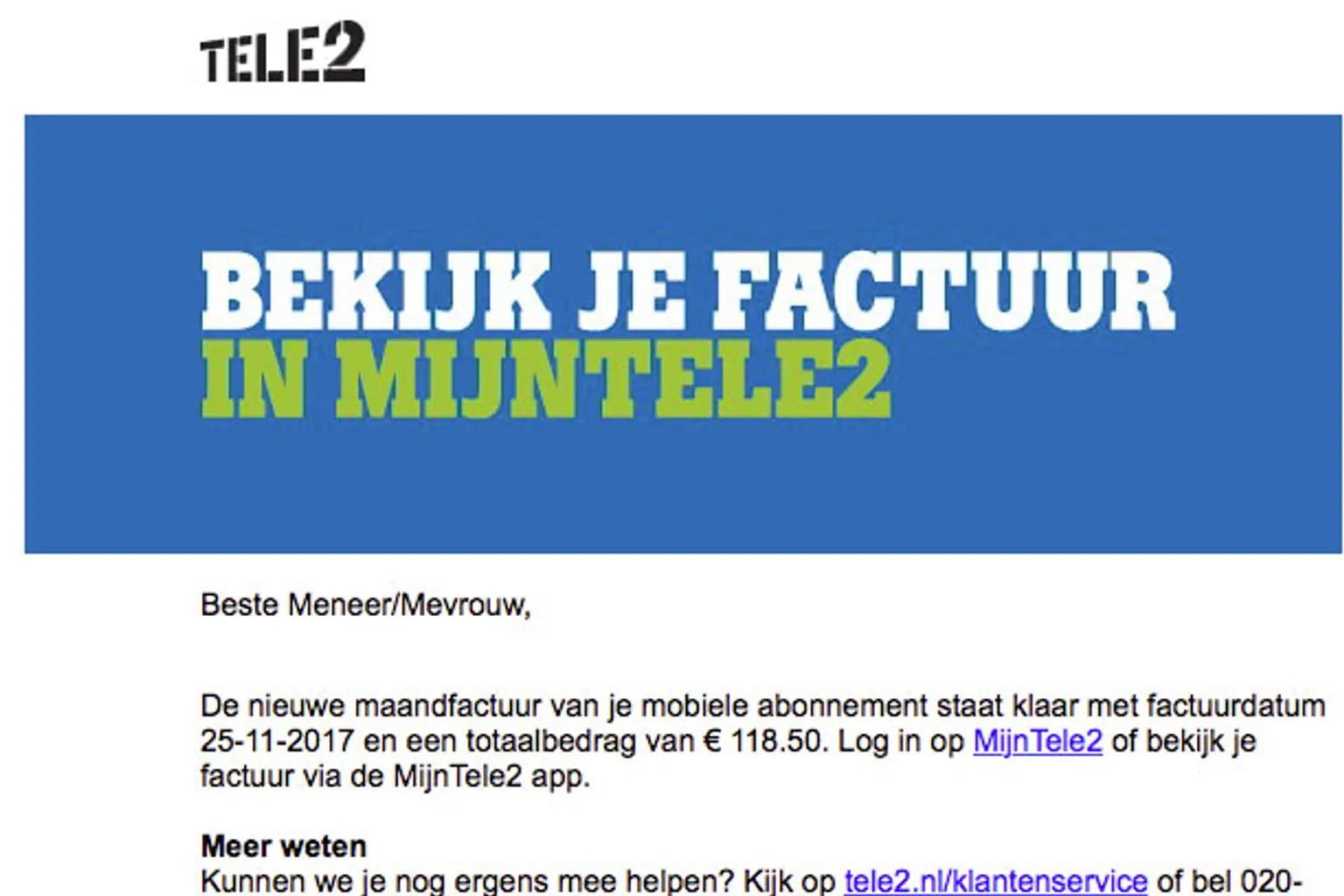 Let op! Er is een valse e-mail in omloop die zogenaamd van Tele2 afkomstig is. Hierin staat dat je maandfactuur voor je klaarstaat. Laat je niet misleiden.