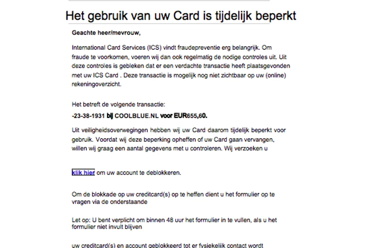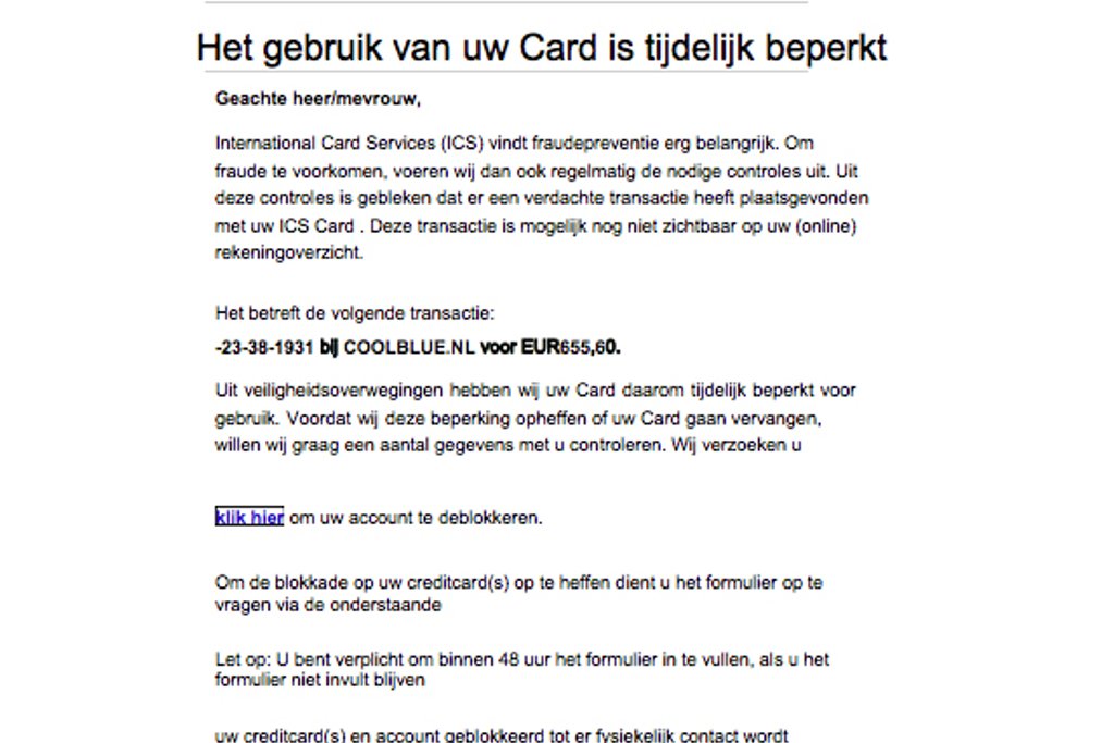 Dit bericht kan je gelijk verwijderen, want ICS heeft niets met dit bericht te maken. Dit kan je onder andere zien aan de url van de pagina waar je inlogt. Ook staan er een aantal bedreigingen in het bericht, waaronder dat je card geblokkeerd blijft als je niet reageert. Twijfel je nog over de echtheid van een mail? Op de officiële website van ICS staat een e-mailadres waarmee je in contact kunt komen met het bedrijf.
