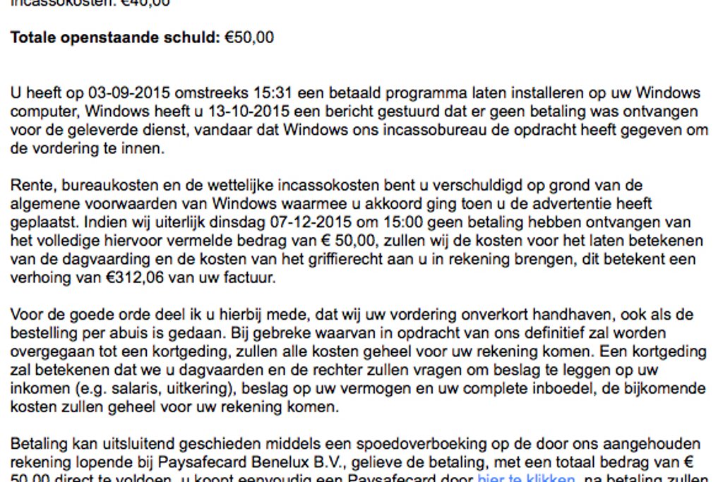Trap hier niet in! Deze mail komt niet van een incassokantoor of Windows. Er wordt in de mail gevraagd om met de PaySafe Card te betalen. Dit is een online betaalmethode waarmee je anoniem geld overmaakt. Deze betaalmethode wordt echter helemaal niet gebruikt door Windows.