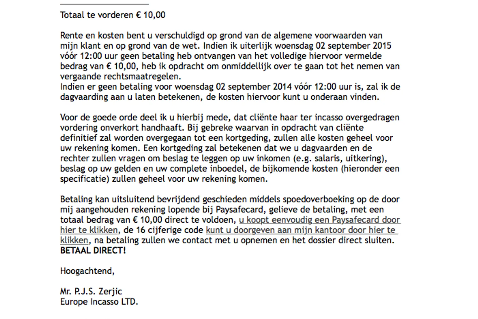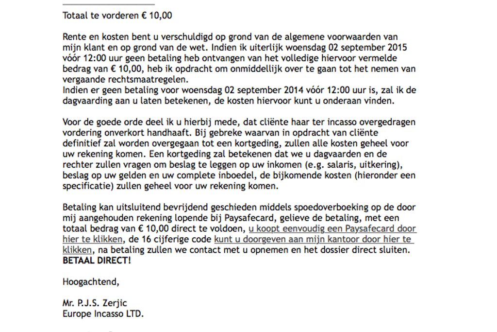 Je wordt verzocht dit bedrag direct te betalen via een Paysafecard. Er wordt gedreigd met een kortgeding, waarbij het bedrag oploopt tot € 462,59. Op deze manier wordt je bang gemaakt en verleid om het relatief kleine bedrag van € 10,00 te betalen. Trap er niet in!
