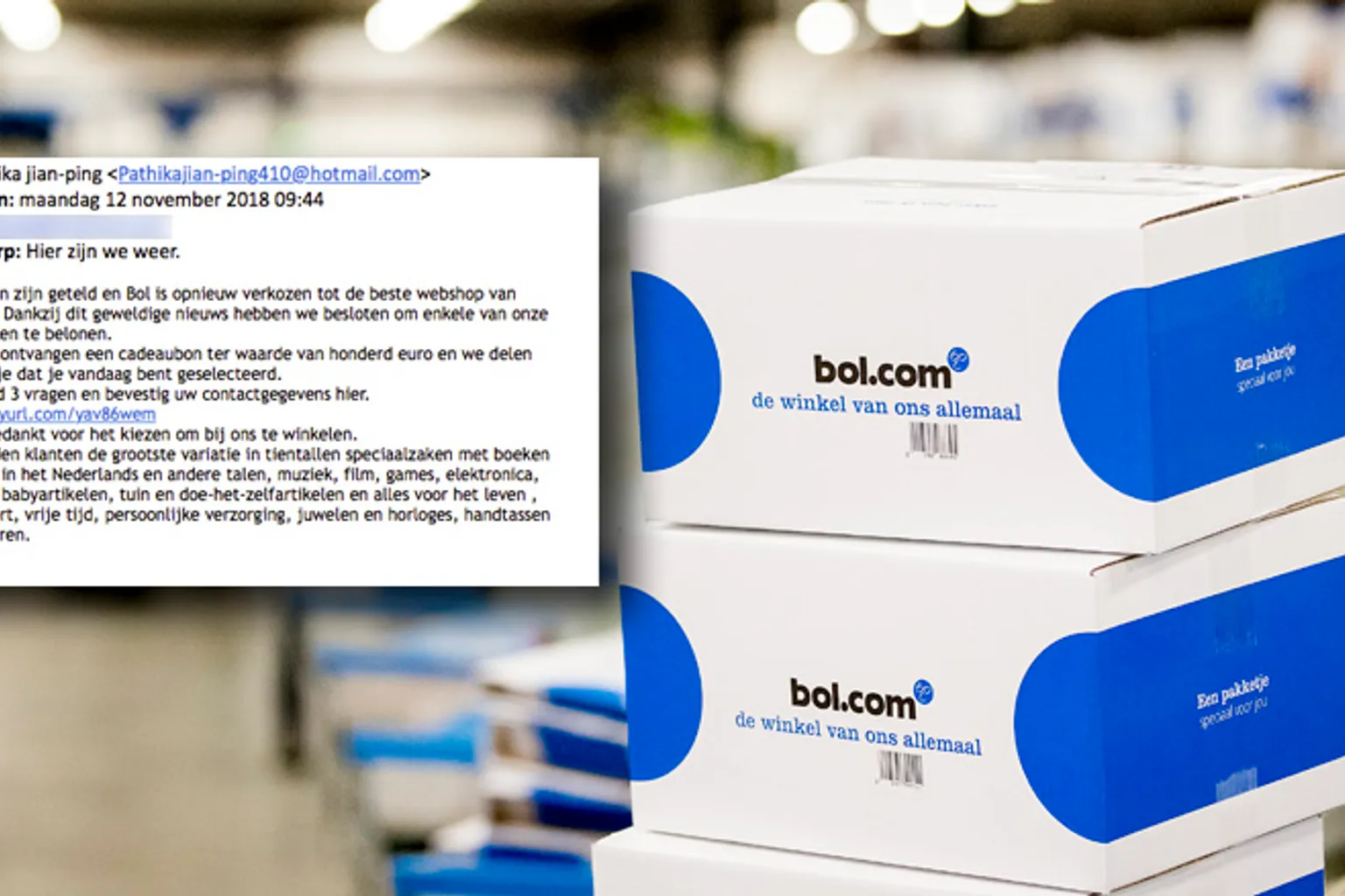Volgens de mail zijn de stemmen geteld en is Bol.com opnieuw verkozen tot de beste webshop van Nederland. Er staat niet in het bericht van welke actie of wedstrijd de stemmen geteld zijn, maar vanwege dit nieuws heeft de winkel zogenaamd besloten om klanten te belonen. Daar zou jij ook een van zijn. Je hebt een cadeaubon ter waarde van €100 gewonnen. Die kan je claimen door een aantal vragen te beantwoorden, die je vindt via de link in de mail.