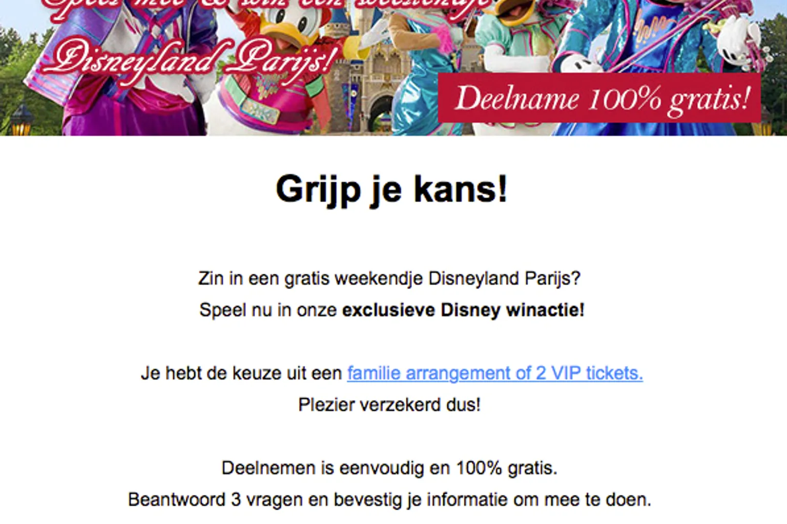 Uit naam van Disneyland Parijs wordt een e-mail verstuurd waarin wordt beweerd dat je een een gratis weekendje naar het vakantiepark kan winnen. De afzenders van dit bericht zijn uit op je gegevens.