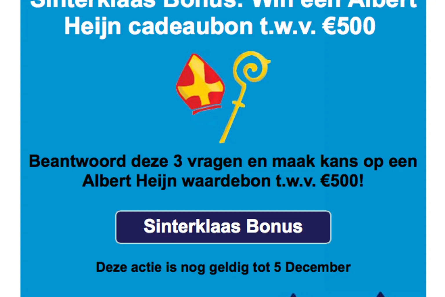 Een 'Action-cadeaukaart van de Sint ter waarde van 400 euro' of een 'Sinterklaas bonus: een Albert Heijn cadeaubon ter waarde van 50 euro'. De strekking is hetzelfde als in de mails van vorige valse winacties.
