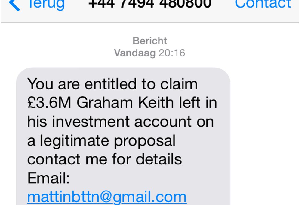 In het bericht staat dat je recht hebt op 3.6 miljoen pond van ene Graham Keith. Ga hier niet op in! In dit soort gevallen wordt vaak gevraagd om een voorschot alvorens je het bedrag ontvangt. Uiteindelijk krijg je je voorschot en het beloofde bedrag niet.
