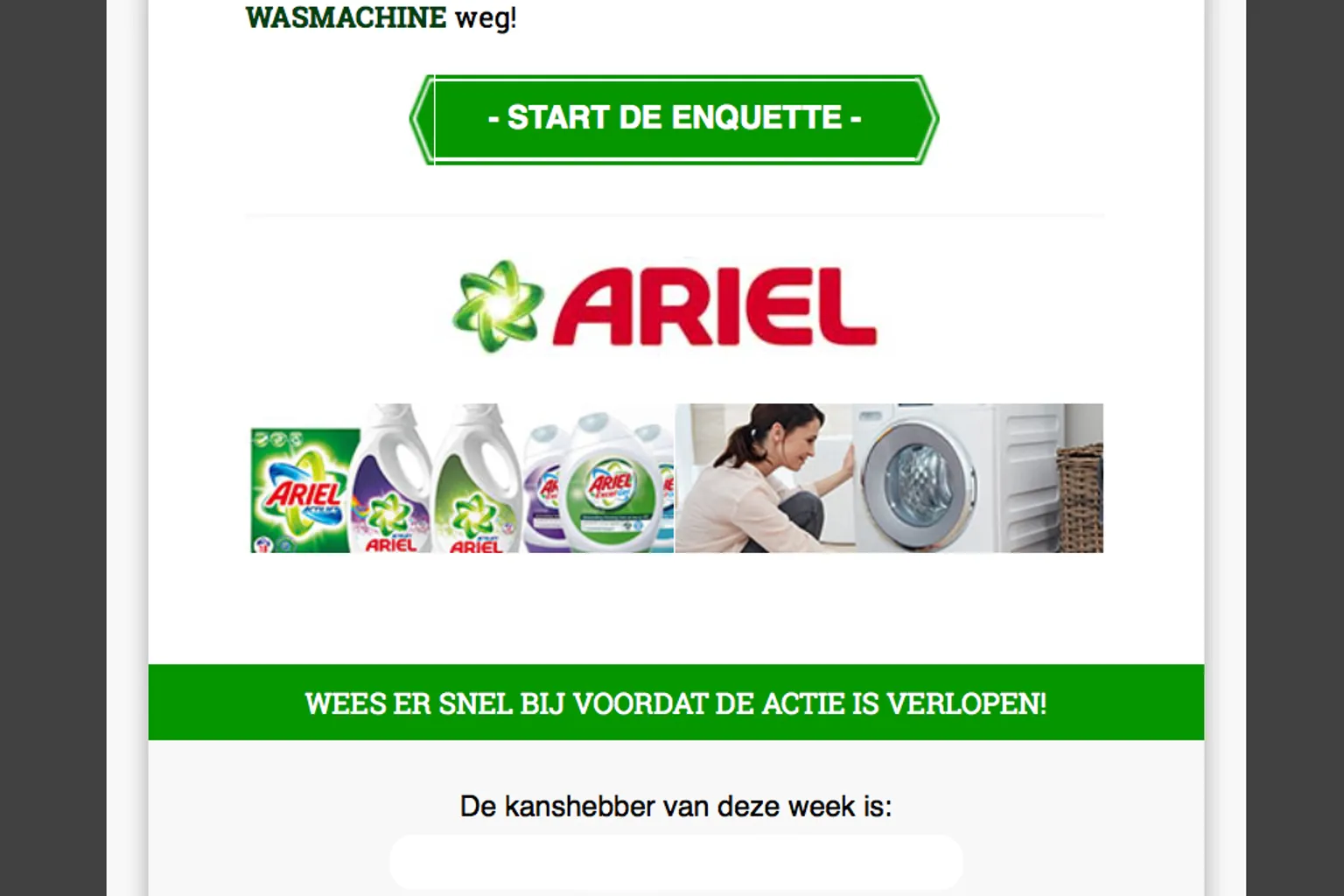 Er zijn opnieuw mails in omloop met de boodschap dat de ontvanger een prijs gewonnen heeft. Dit keer gaat het om wasmiddelen van Ariel en een wasmachine.