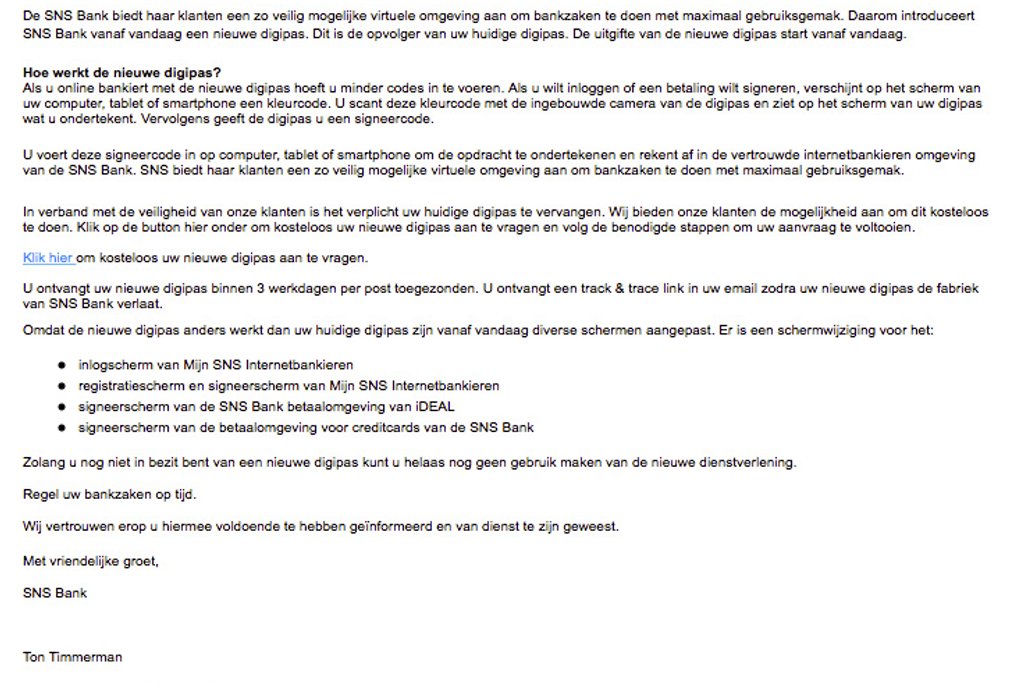 Uit naam van SNS Bank worden valse e-mails verstuurd. Daarin wordt beweerd dat de bank vanaf vandaag een nieuwe digipas aanbiedt. Je dient deze zogenaamd via een link te bestellen. Doe dit niet!