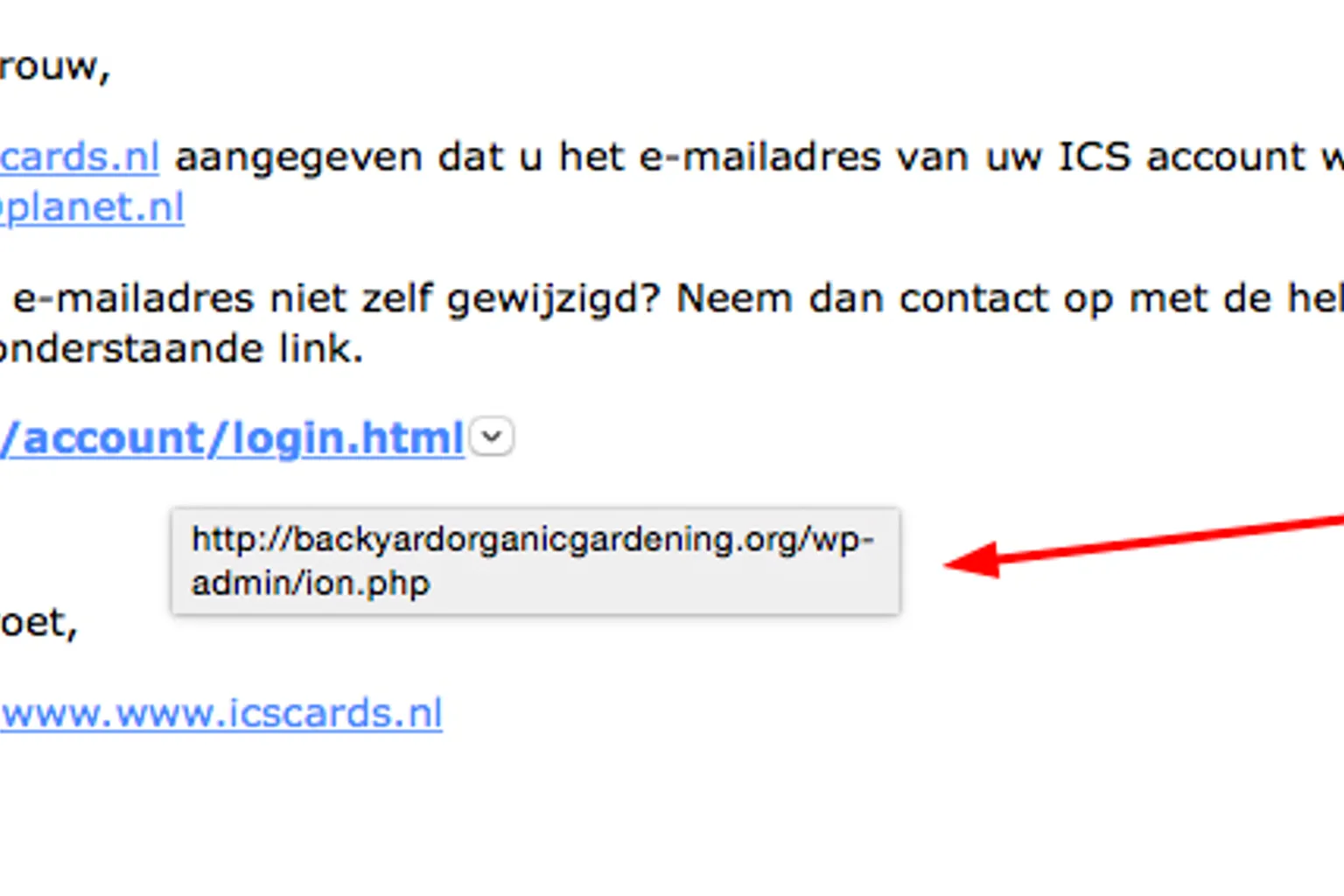 Als je met de cursor van je muis op de link gaat staan, zonder deze aan te klikken, kun je zien dat deze niet verwijst naar icscards.nl.