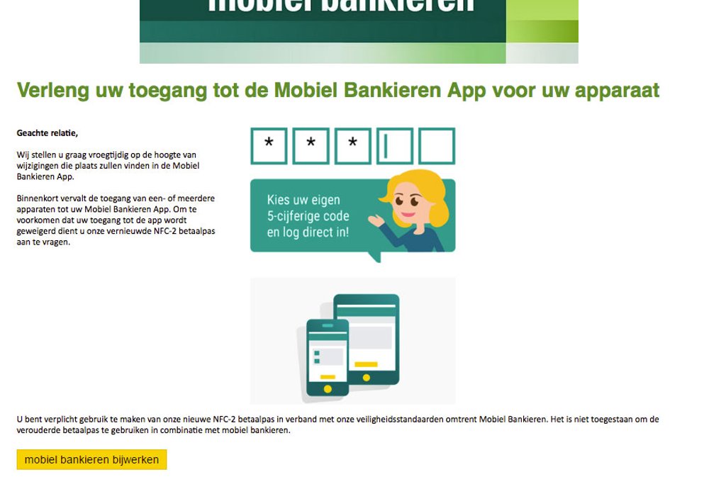 Volgens de e-mail dien je de vernieuwde NFC-2 betaalpas aan te vragen om te voorkomen dat je toegang tot de app wordt geweigerd. Dit kun je doen door op de button 'Mobiel bankieren bijwerken' in het bericht te klikken.