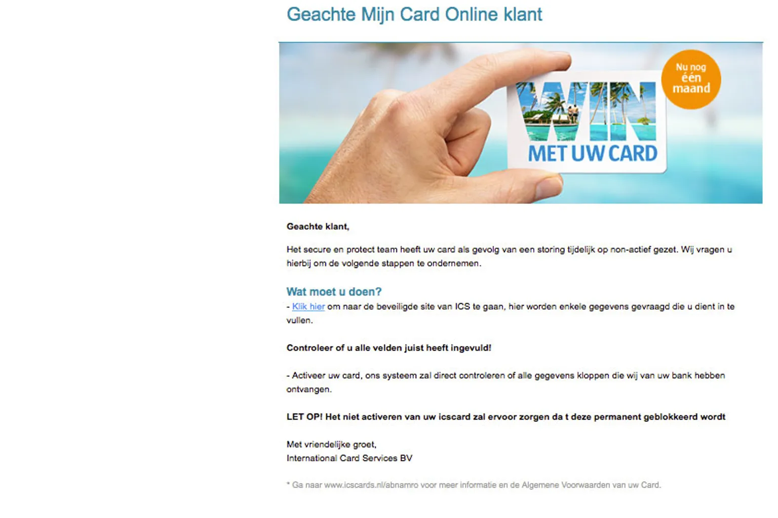 Volgens het bericht moet je een aantal stappen doorlopen om je kaart weer actief te maken. Wanneer je geen actie onderneemt, wordt je kaart zogenaamd permanent geblokkeerd.