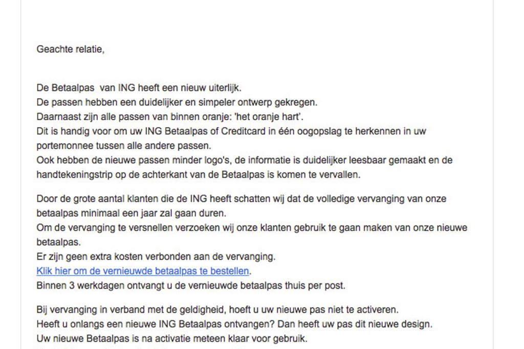Phishingmail 'ING' bevat onjuiste informatie over nieuwe betaalpas