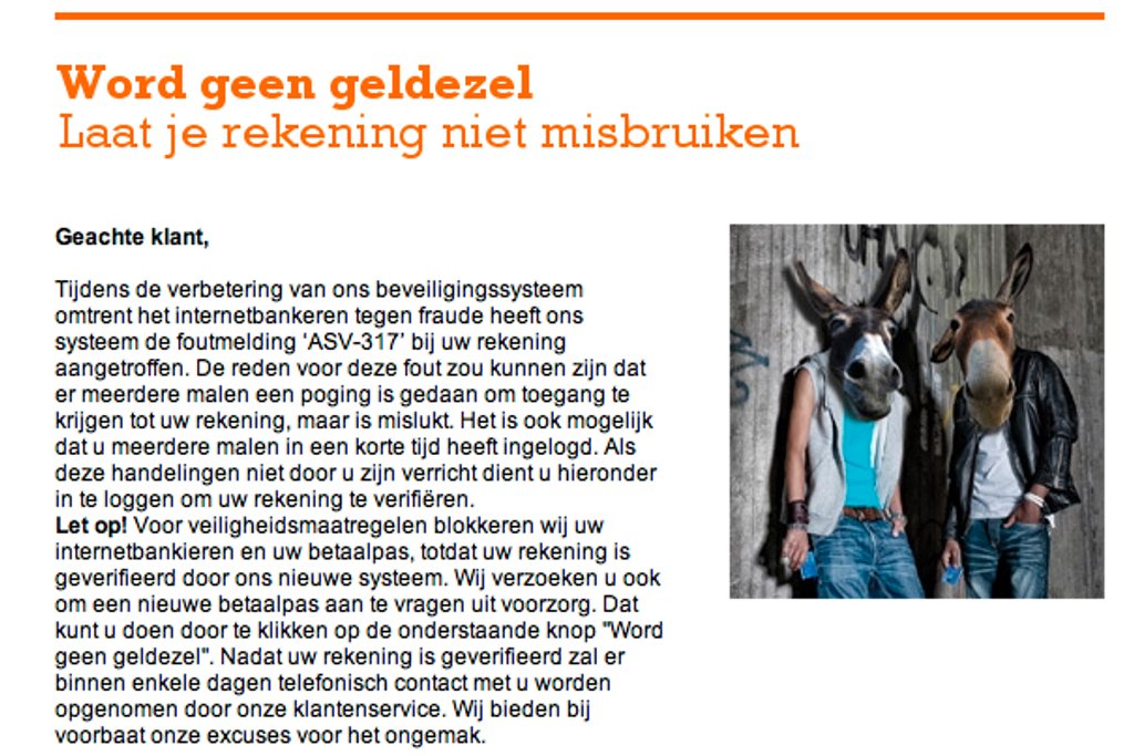 Wederom gaat er een valse mail van ING rond. De zender beweert dat wegens veiligheidsoverwegingen je account is geblokkeerd. Om de blokkering op te heffen moet je je rekening verifiëren. Dit doe je door op 'wordt geen geldezel' te klikken. Doe dit niet! Via de link wordt je doorverwezen naar een site speciaal opgebouwd door oplichters om je gegevens te ontfutselen. Je kan deze e-mail dus direct verwijderen.