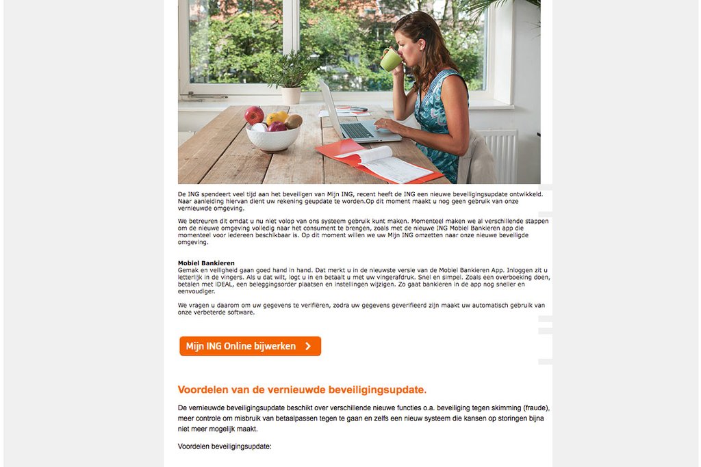 ING zou zogenaamd een vernieuwde Mobiel Bankieren App hebben. De vernieuwde app zou sneller en makkelijker in gebruik zijn. Het is dus van belang dat je deze snel tot je beschikking hebt. Hiervoor dien je eerst je gegevens te delen. Dit kun je doen door op de button 'Mijn ING Online bijwerken' te klikken. Wij raden je ten zeerste af dit te doen. De link verwijst je naar een phishingsite.