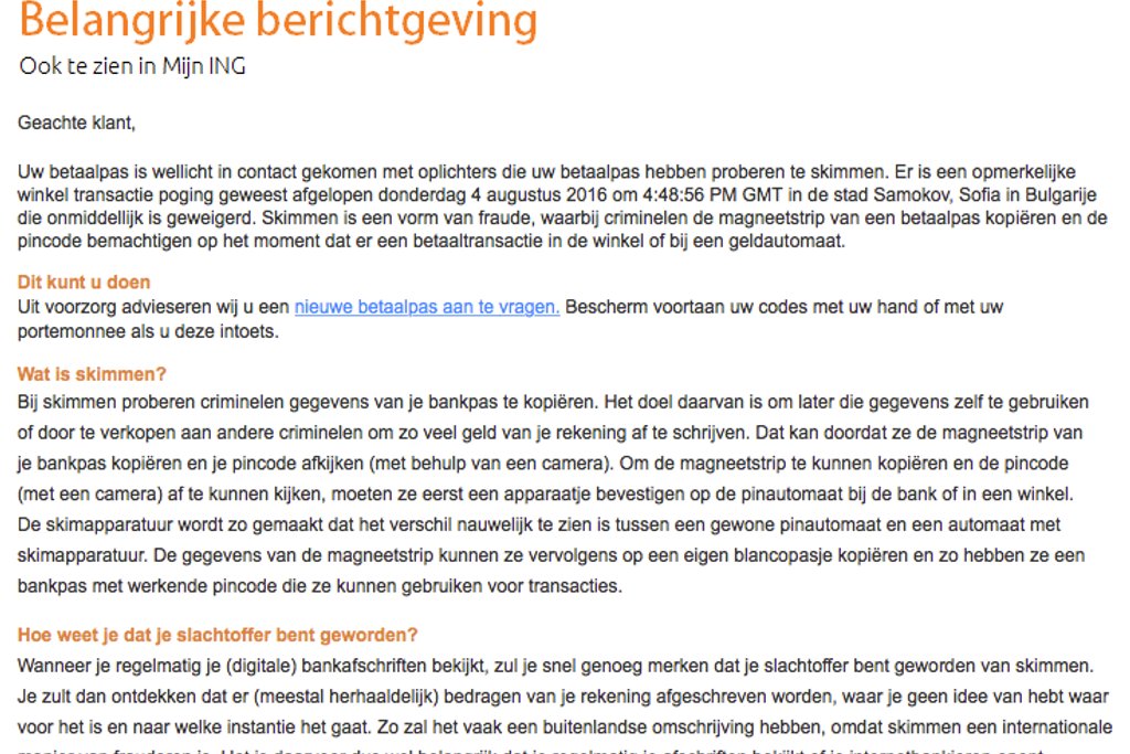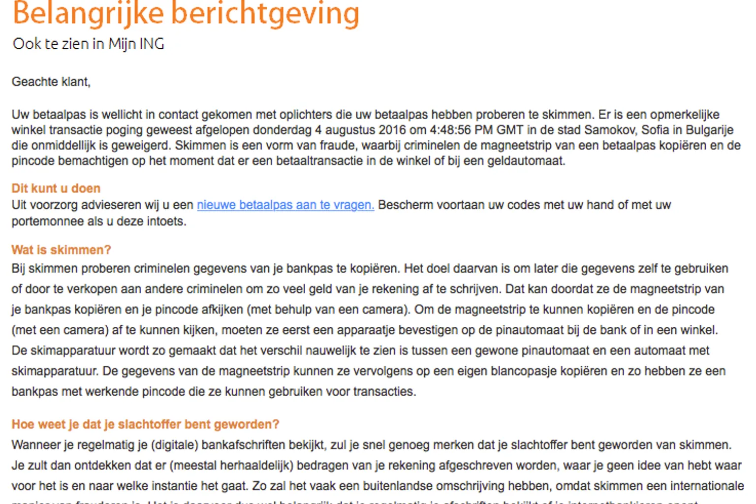 Volgens de mail hebben 'oplichters geprobeerd jouw betaalpas te skimmen'. Dat zou afgelopen donderdag gebeurd moeten zijn. In de mail staat dat je uit voorzorg een nieuwe betaalpas aan moet vragen. Als je op de link klikt, kom je op een webpagina waar je jouw bankgegevens in moet vullen.