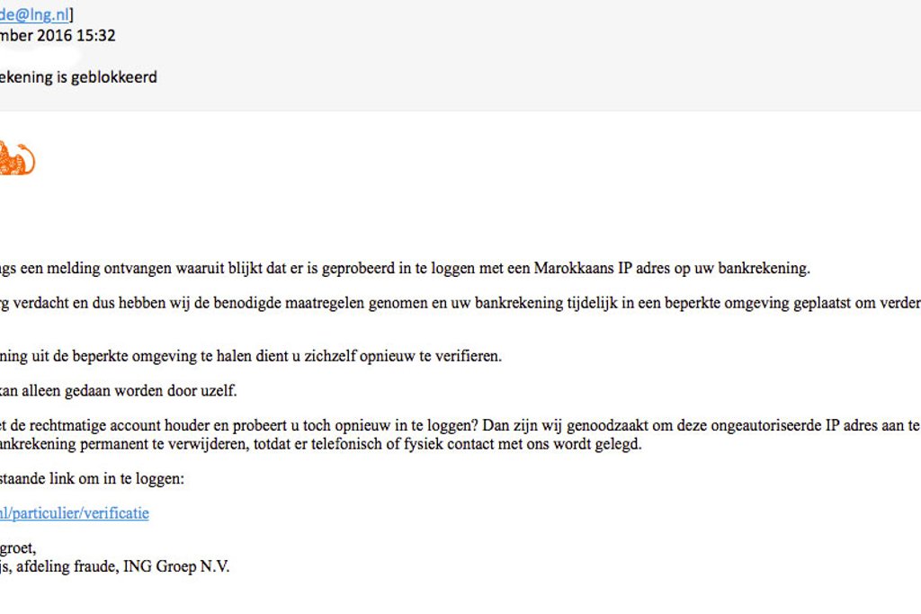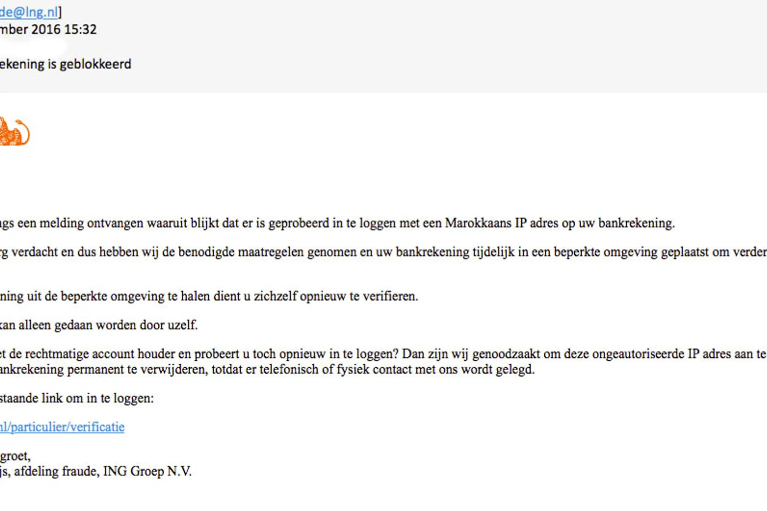 Door de inlogpoging zou ING hebben besloten om je bankrekening tijdelijk in een beperkte omgeving te zetten. Om dit ongedaan te maken, moet je jouw account volgens de e-mail opnieuw verifiëren. Dit kan je regelen via een link in de tekst.