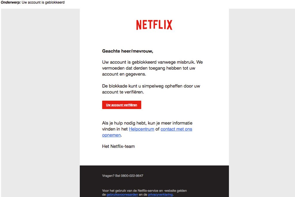 Volgens de afzender van de e-mail is je account bij de online streamingdienst geblokkeerd aangezien het vermoeden bestaat dat derden toegang hebben tot je gegevens. Door je account te verifiëren zou je de blokkade kunnen opheffen.