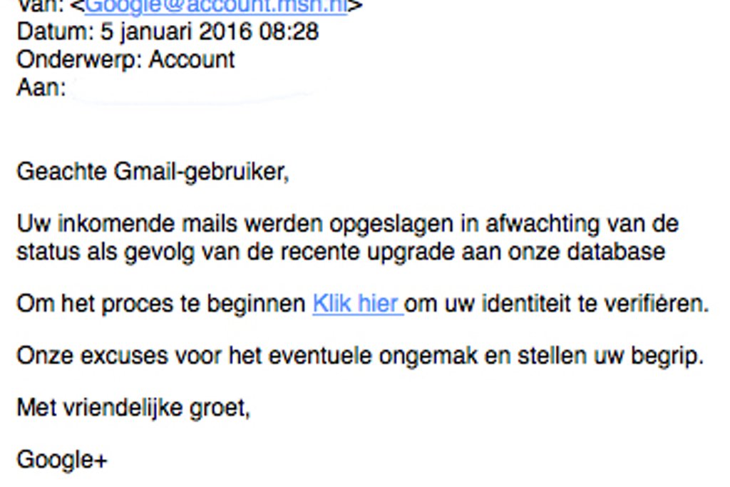Klik niet op de link en vul je gegevens niet in! Dit is phishing. De webpagina die volgt op de link lijkt op de inlogpagina van Gmail, maar dit is geen officiële website van Google.