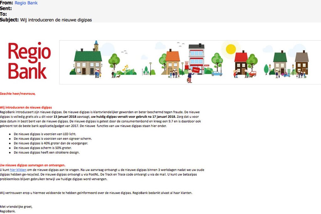 Let op! Opnieuw ontvangen wij veel meldingen over een e-mail die uit naam van Regiobank wordt verstuurd. Hierin staat dat je huidige digipas vervalt. Dit is phishing.