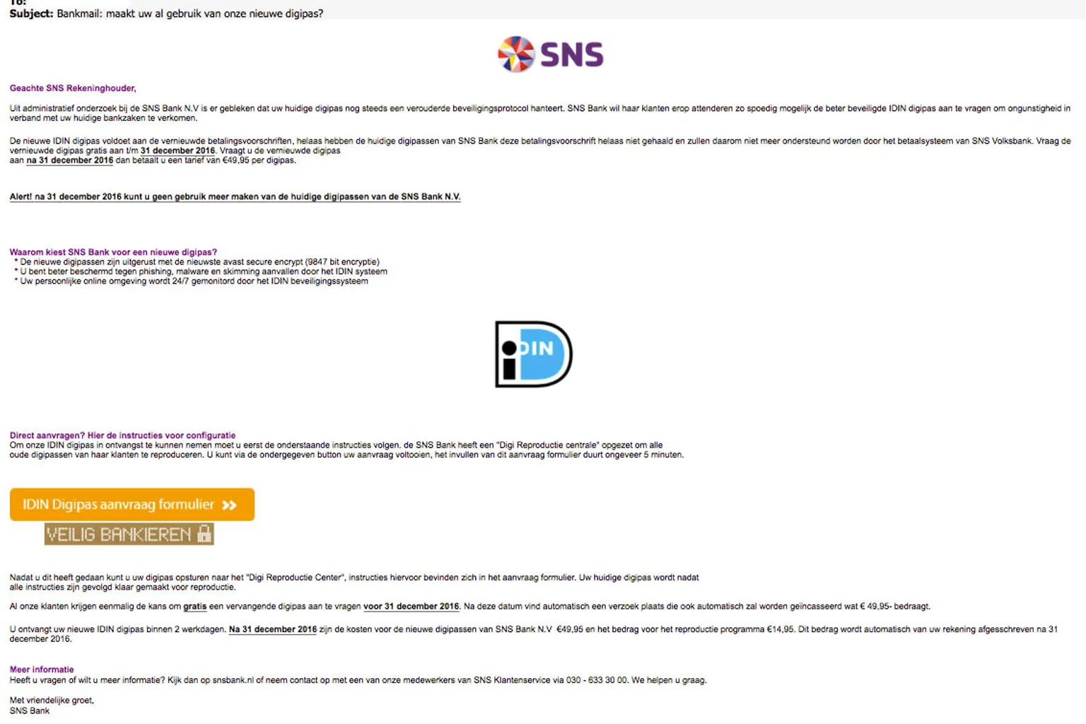 Phishingmail 'SNS Bank' over nieuwe digipas