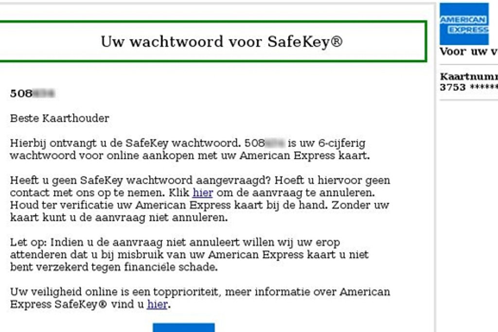 Heb je een e-mail gekregen van creditcardmaatschappij 'American Express' over een wachtwoord voor 'SafeKey'? Dit is een valse e-mail.