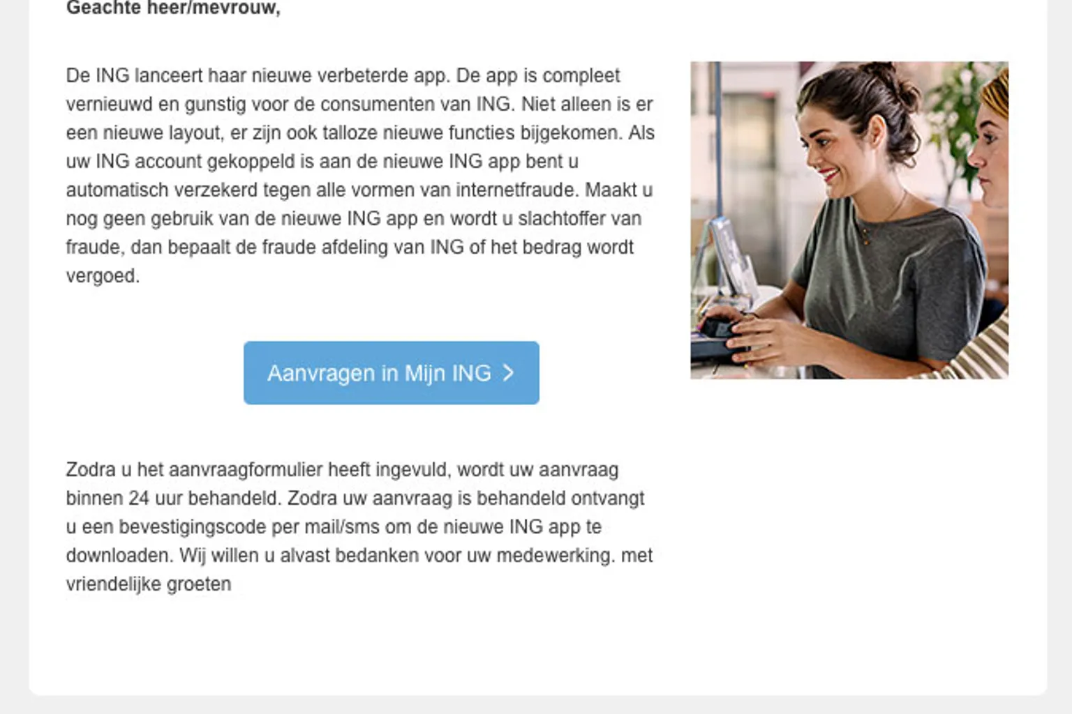 Er is een e-mail in omloop uit naam van ING waarin staat dat ze een nieuwe app hebben. Als je je account van de bank koppelt aan de app, zou je verzekerd zijn tegen alle vormen van internetfraude. De e-mail is zelf echter een frauduleuze phishingmail.