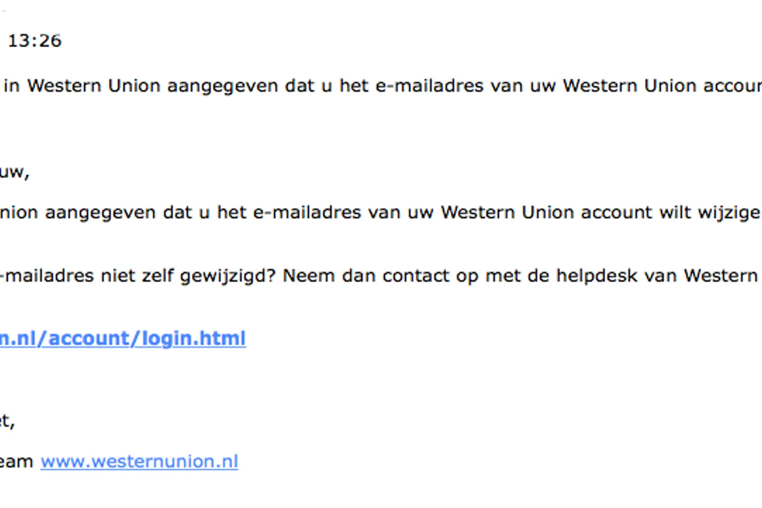 Phishingmail Western Union: 'e-mailadres gewijzigd'