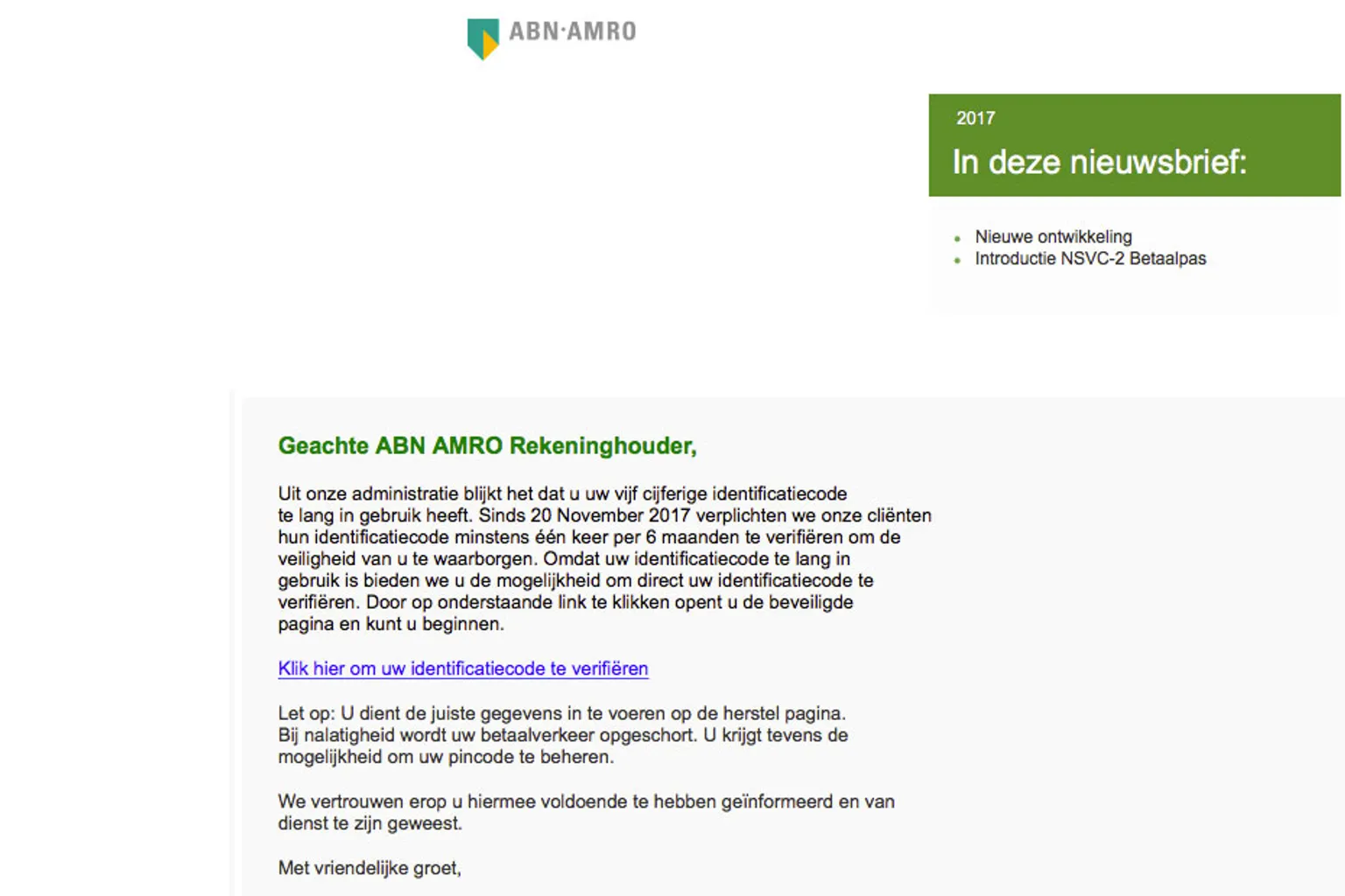 Volgens de e-mail is uit de administratie van de bank gebleken dat je je identificatiecode te lang in gebruik hebt. Ook staat er dat je deze sinds kort minstens één keer in de zes maanden moet verifiëren om de veiligheid te waarborgen. De bank biedt je zogenaamd de mogelijkheid direct je code te verifiëren. Dit zou je kunnen doen door op bijgevoegde link te klikken. Trap hier niet in!