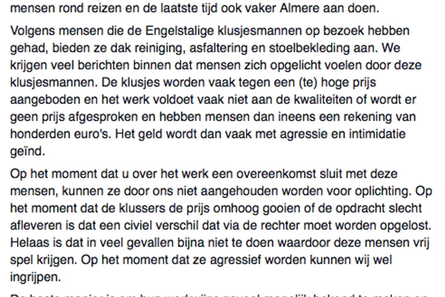 De klusjesmannen bieden hun diensten aan voor een vaak (te) hoge prijs en leveren weinig kwaliteit, of ze spreken geen prijs af en vragen later honderden euro's. Bij het innen van het geld gedragen de klusjesmannen zich vaak agressief.