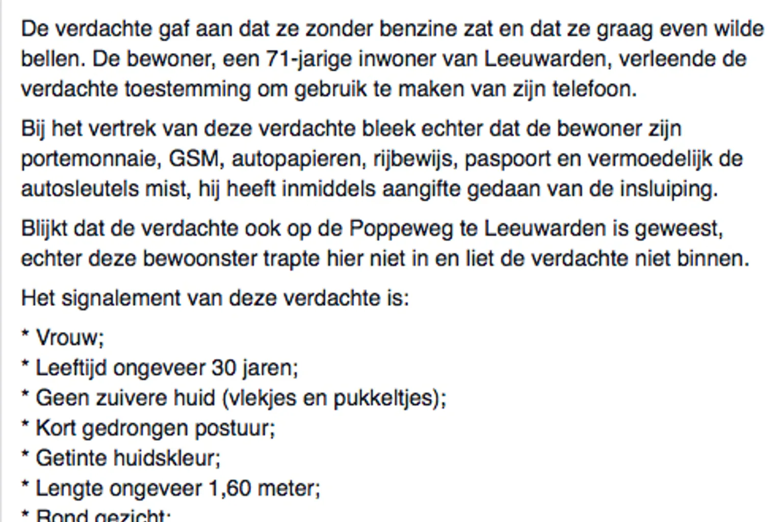 De politie Leeuwarden waarschuwt voor een persoon die door middel van een babbeltruc probeert huizen binnen te komen en zo spullen te stelen.