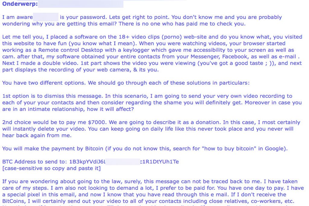 De politie krijgt veel meldingen over afpersmails waarin wordt beweerd dat je computer is gehackt en dat je bent gefilmd tijdens het bezoeken van een pornosite. Opgelicht?! waarschuwde al eerder voor deze e-mails. In de meest recente variant wordt misbruik gemaakt van gelekte wachtwoorden.