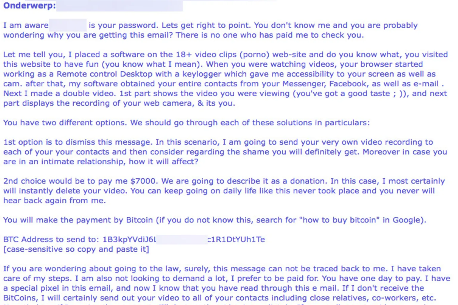 In de meest recente e-mails wordt het wachtwoord van de ontvanger genoemd. Hierdoor lijkt het alsof de afperser daadwerkelijk de beschikking heeft over jouw gegevens. Die wachtwoordgegevens zijn echter anderhalf jaar geleden bij een hack buitgemaakt en online gezet.