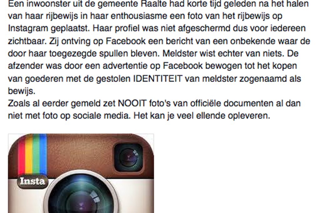 "Een inwoonster uit de gemeente Raalte had korte tijd geleden na het halen van haar rijbewijs in haar enthousiasme een foto van het rijbewijs op Instagram geplaatst. Haar profiel was niet afgeschermd dus voor iedereen zichtbaar. Zij ontving op Facebook een bericht van een onbekende waar de door haar toegezegde spullen bleven. Meldster wist echter van niets. De afzender was door een advertentie op Facebook bewogen tot het kopen van goederen met de gestolen IDENTITEIT van meldster zogenaamd als bewijs. Zoals al eerder gemeld zet NOOIT foto's van officiële documenten al dan niet met foto op sociale media. Het kan je veel ellende opleveren."