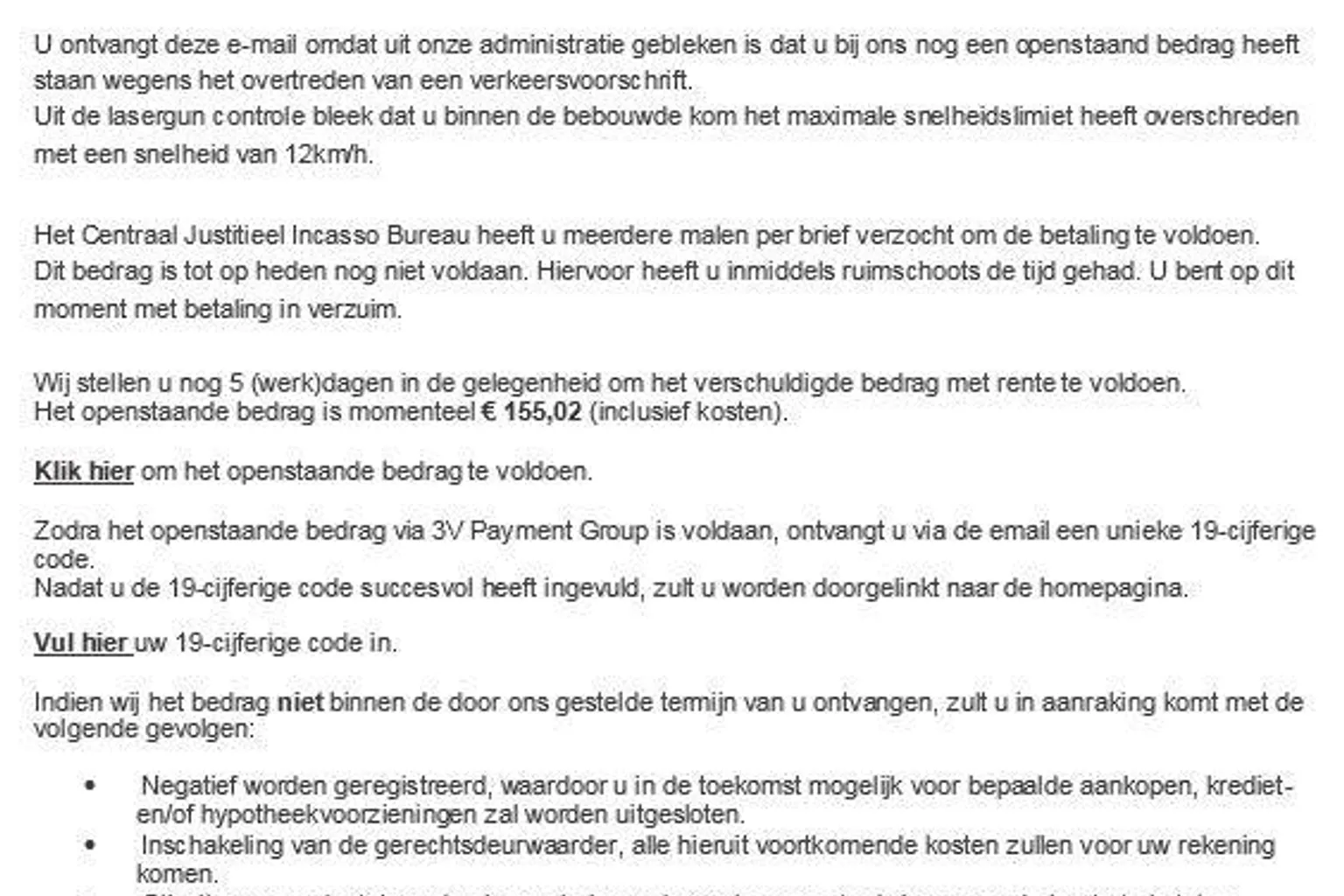 'Schrik niet als u een mail krijgt van de politie over een openstaande boete. Deze is niet echt! Oplichters gebruiken het logo en de naam van de politie om u te laten betalen voor een boete die er nooit is geweest. Graag delen om slachtoffers van deze oplichting te voorkomen!'
