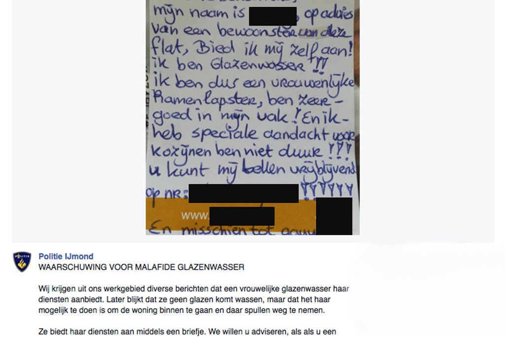 Politie IJmond waarschuwt voor een vrouwelijke glazenwasser die niet komt om je ramen te lappen.