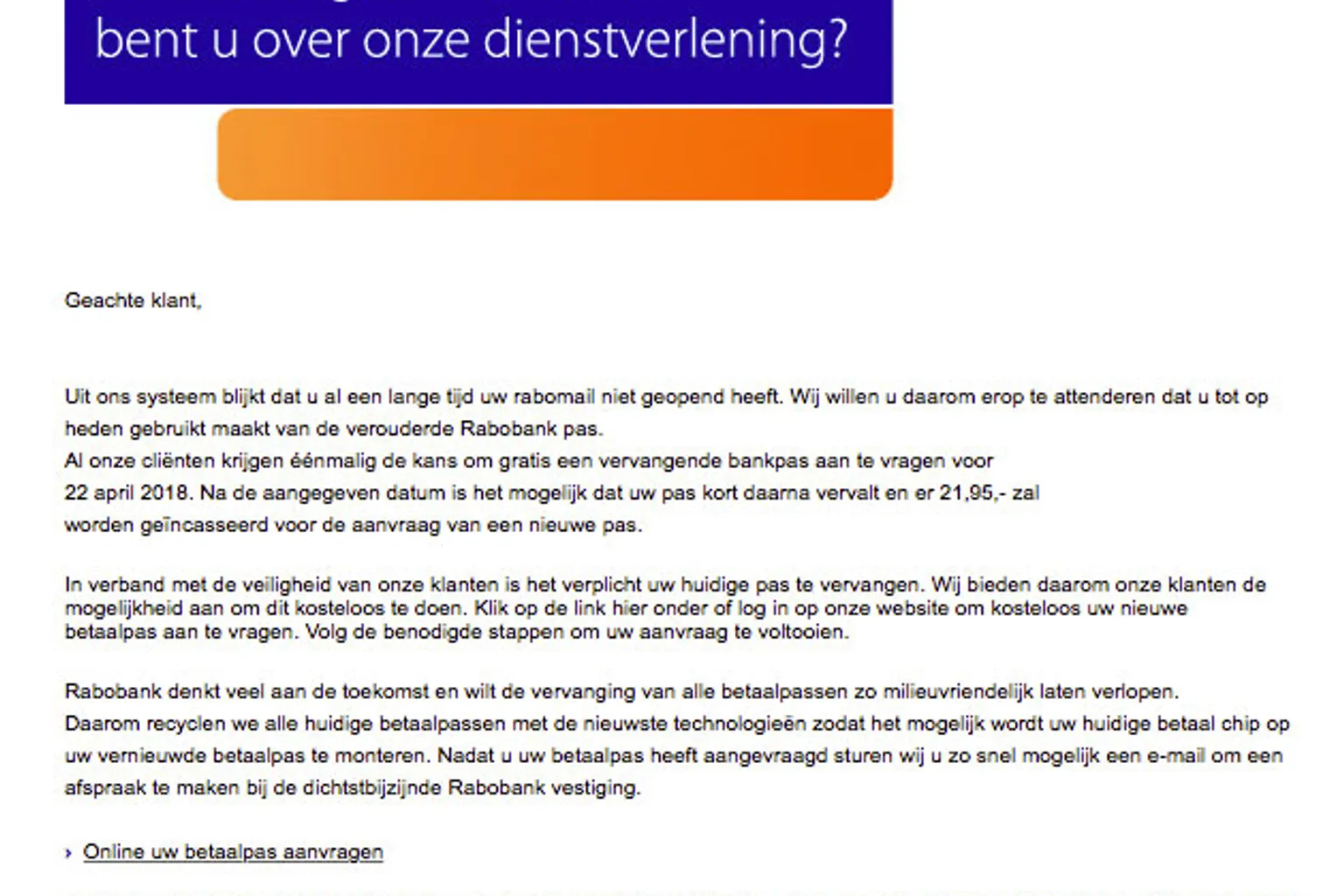 In de e-mail staat geschreven dat je nieuwe kaart aan dient te vragen voor 22 april 2018, hierna zal het je geld kosten. Oplichters schrijven in phishingmails vaker urgente boodschappen. Zo proberen ze je in hun val te laten trappen.