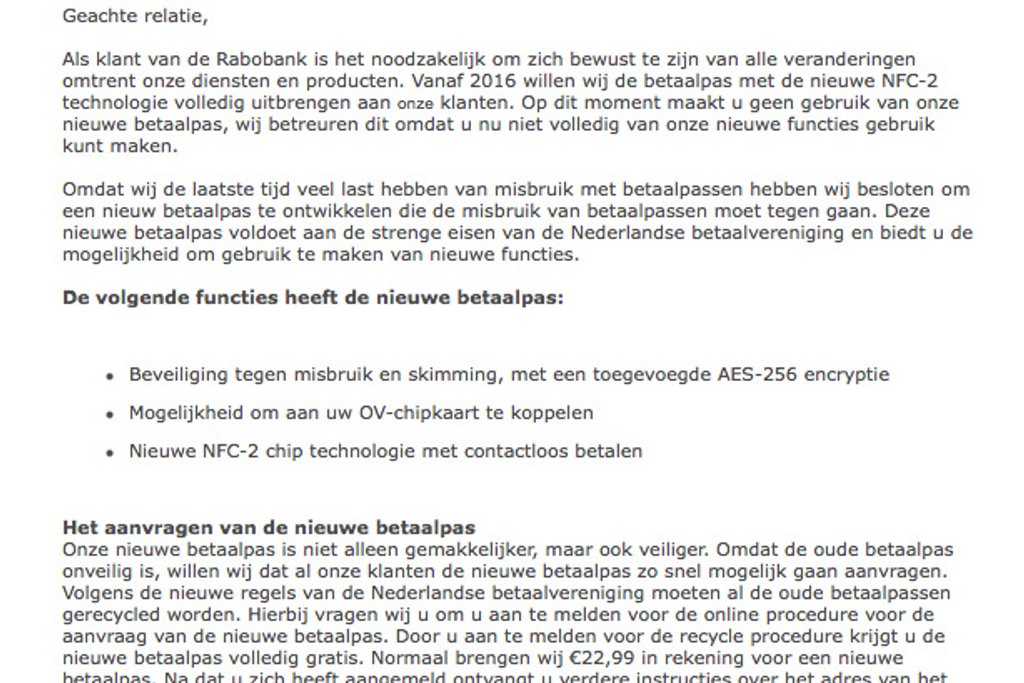 Rabobank 'Aanvraag nieuwe betaalpas' is nep