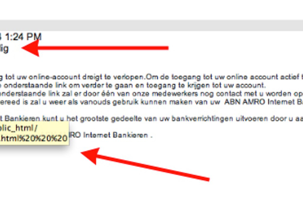 - De aanhef van de mail is 'Geachte ABN AMRO (!!) cliënt', terwijl de mail uit naam van de Rabobank is verstuurd. Ook in de tekst wordt over ABN AMRO gesproken.