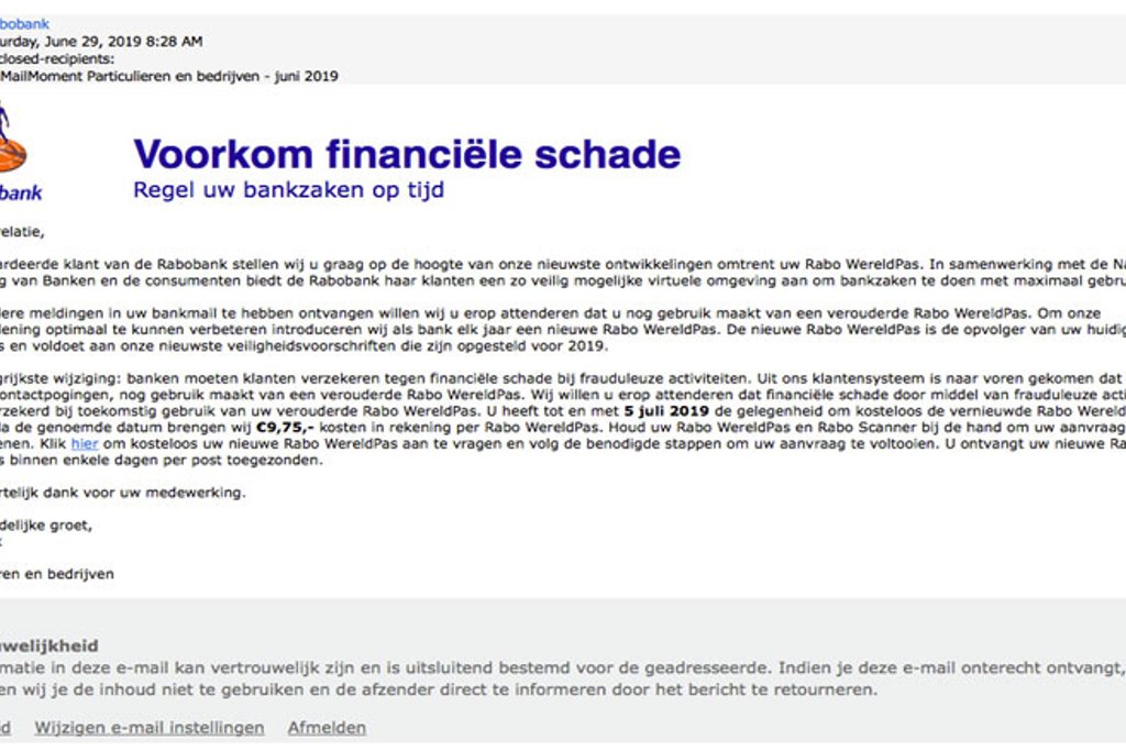 'Als gewaardeerde klant van de Rabobank stellen wij u graag op de hoogte van onze nieuwste ontwikkelingen omtrent uw Rabo WereldPas.' Zo begint de valse e-mail. Je hebt zogenaamd al meerdere meldingen in je bankmail ontvangen over de verouderde Rabo WereldPas die je gebruikt. En je hebt nu tot 5 juli de tijd om een nieuwe aan te vragen. Of anders wordt er 9,75 euro in rekening gebracht. Trap hier niet in!